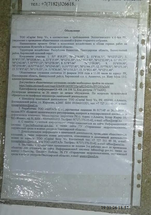 По проекту: Отчет о возможных воздействиях к «План горных работ на месторождении Жуантобе в Павлодарской области»