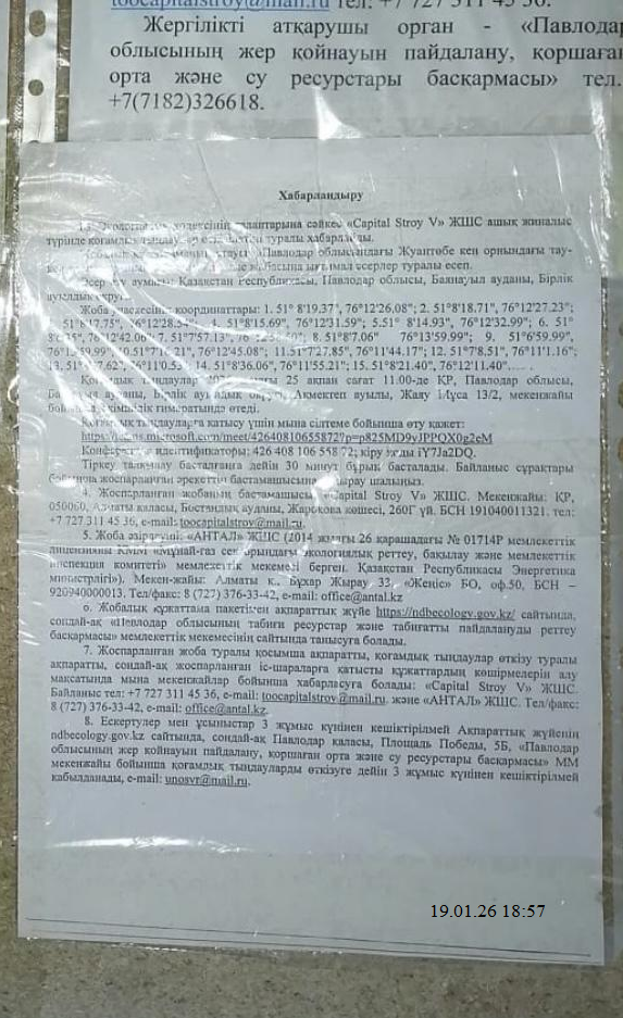 3. Общественные слушания организованны: УПРАВЛЕНИЕ НЕДРОПОЛЬЗОВАНИЯ, ОКРУЖАЮЩЕЙ СРЕДЫ И ВОДНЫХ РЕСУРСОВ ПАВЛОДАРСКОЙ ОБЛАСТИ, unosvr@mail.ru, 87182321681,
