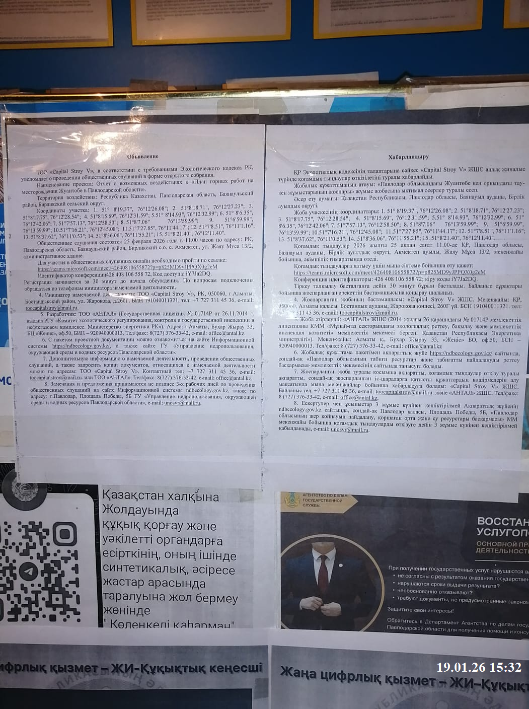 6. Объявление о проведении общественных слушаний на казахском и русском языках будет распространено следующими способами: