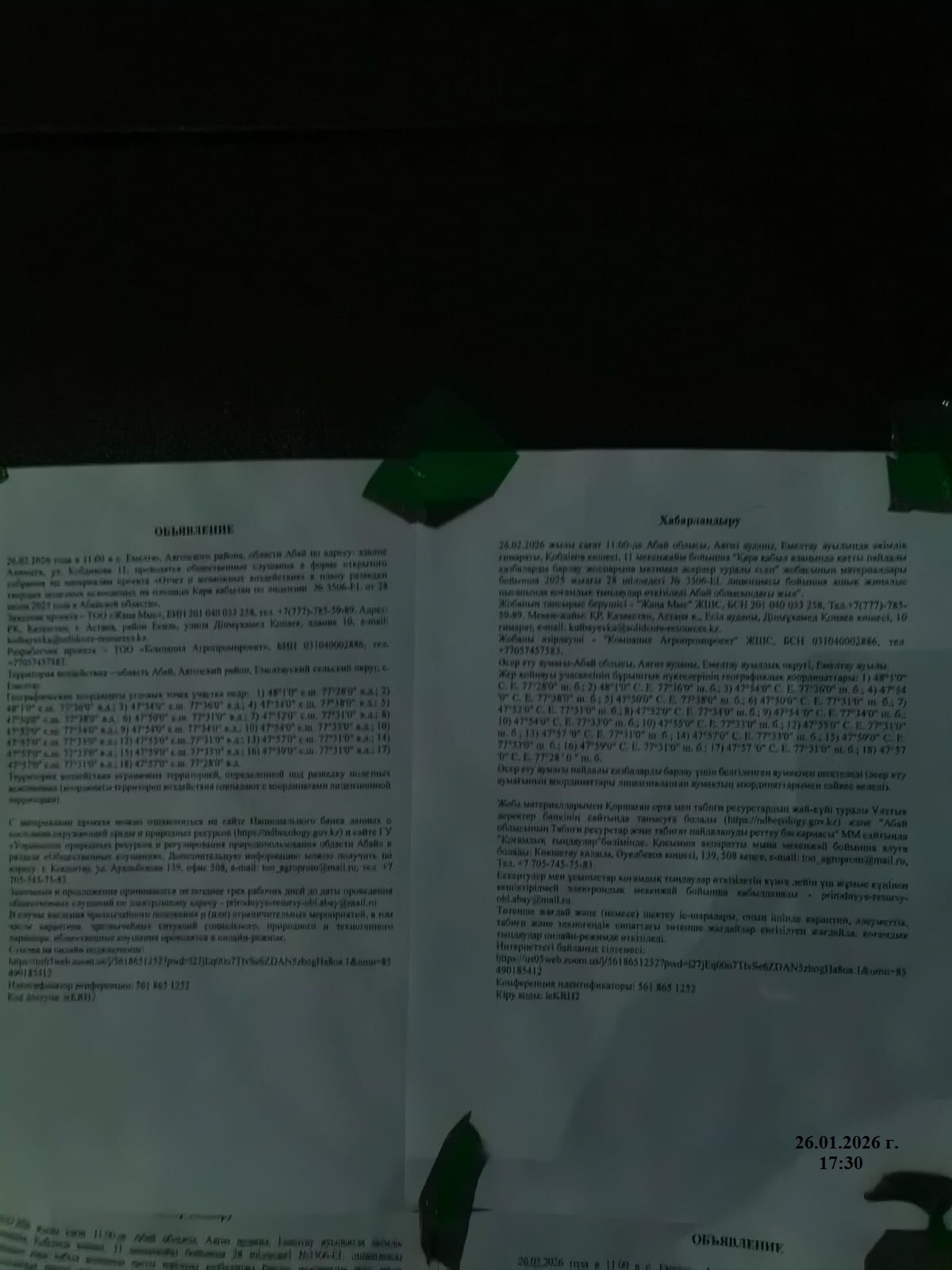 3. Общественные слушания организованны: Главный специалист УПР и ПР область Абай, prirodnyye_resursy_obl.abay@mail.ru,