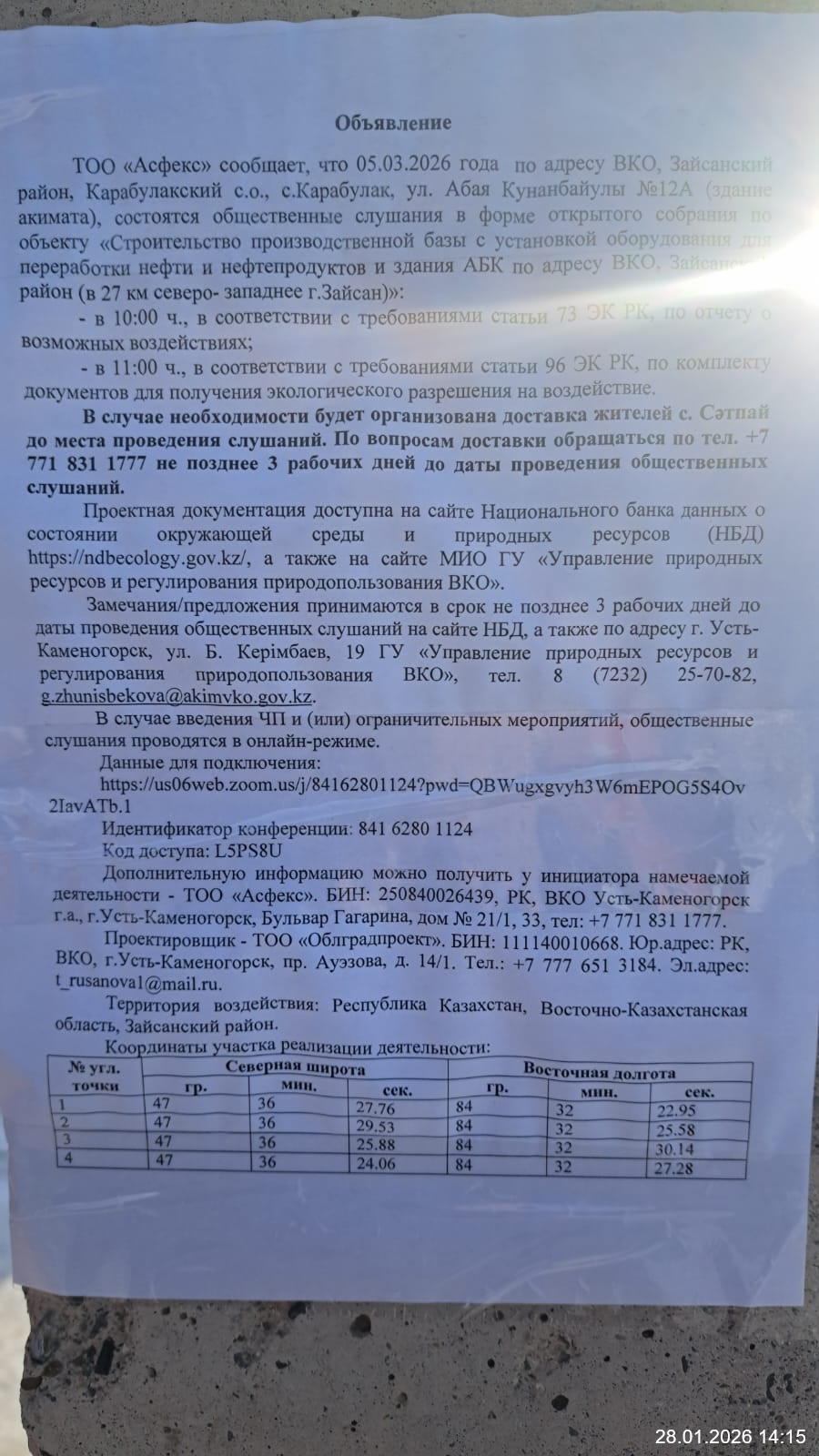 3. Общественные слушания организованны: Управление природных ресурсов и регулирования природопользования Восточно-Казахстанской области, g.zhunisbekova@akimvko.gov.kz,