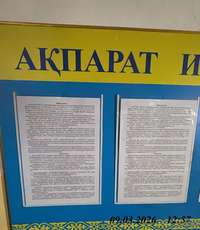 6.3. расположение мест, специально предназначенных для Размещения печатных объявлений (доски объявлений): Жамбылская область, Мойынкумский район, Чиганакская п.а., п.Шыганак, ул.Сейфуллина, 1б, здание акимата