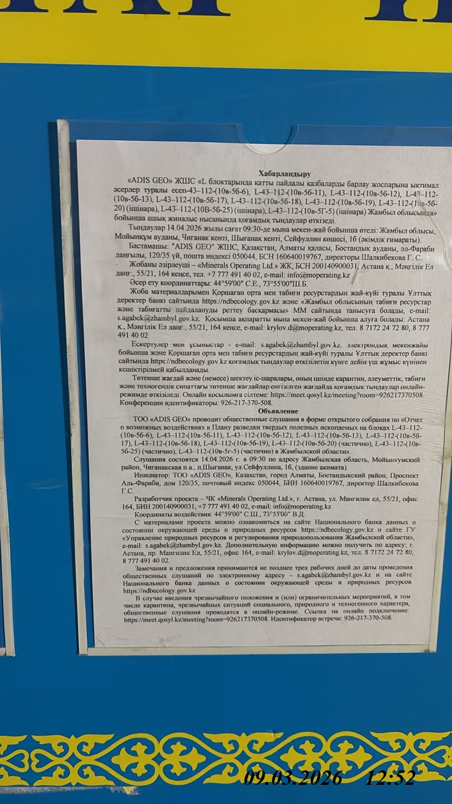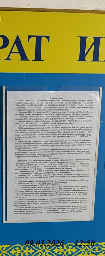 1.4. Описание для подключения к онлайн трансляции при прохождении общественного слушания: Приглашение на запланированную встречу в Qosyl Тема встречи: Товарищество с ограниченной ответственностью ""ADIS GEO" Время встречи: 14.04.2026 09:30 Длительность встречи: 01 час. Идентификатор встречи: 926-217-370-508 Подключиться к встрече в Qosyl: https://meet.qosyl.kz/meeting?room=926217370508