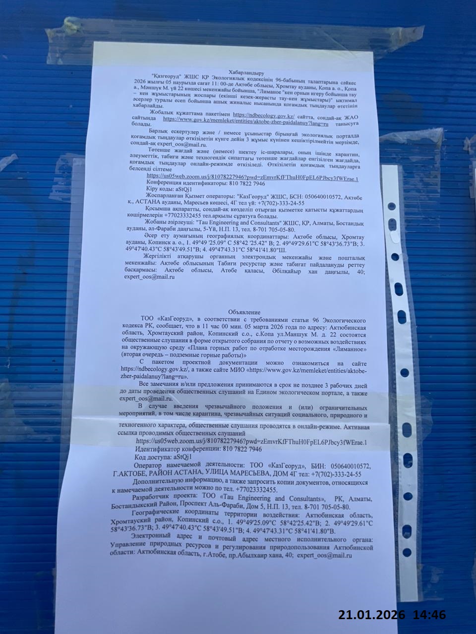 3. Общественные слушания организованны: Управление природных ресурсов и регулирования природопользования Актюбинской области, expert_oos@mail.ru,