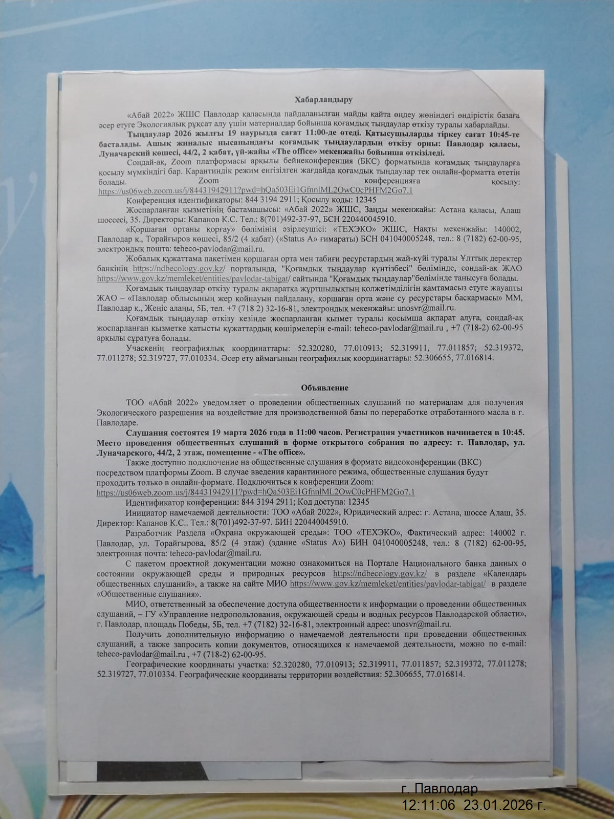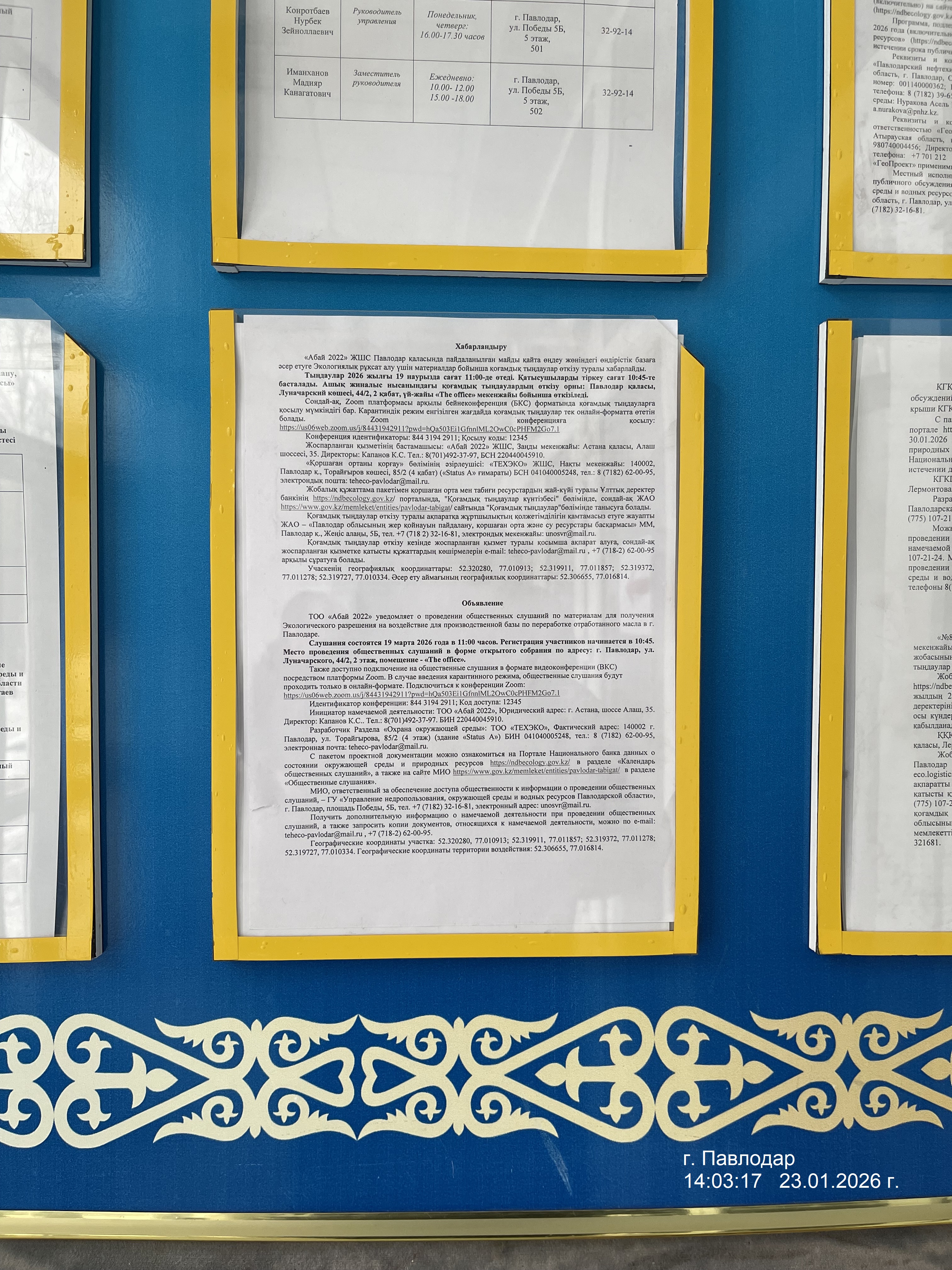 3. Общественные слушания организованны: УПРАВЛЕНИЕ НЕДРОПОЛЬЗОВАНИЯ, ОКРУЖАЮЩЕЙ СРЕДЫ И ВОДНЫХ РЕСУРСОВ ПАВЛОДАРСКОЙ ОБЛАСТИ, unosvr@mail.ru, 87182321681,