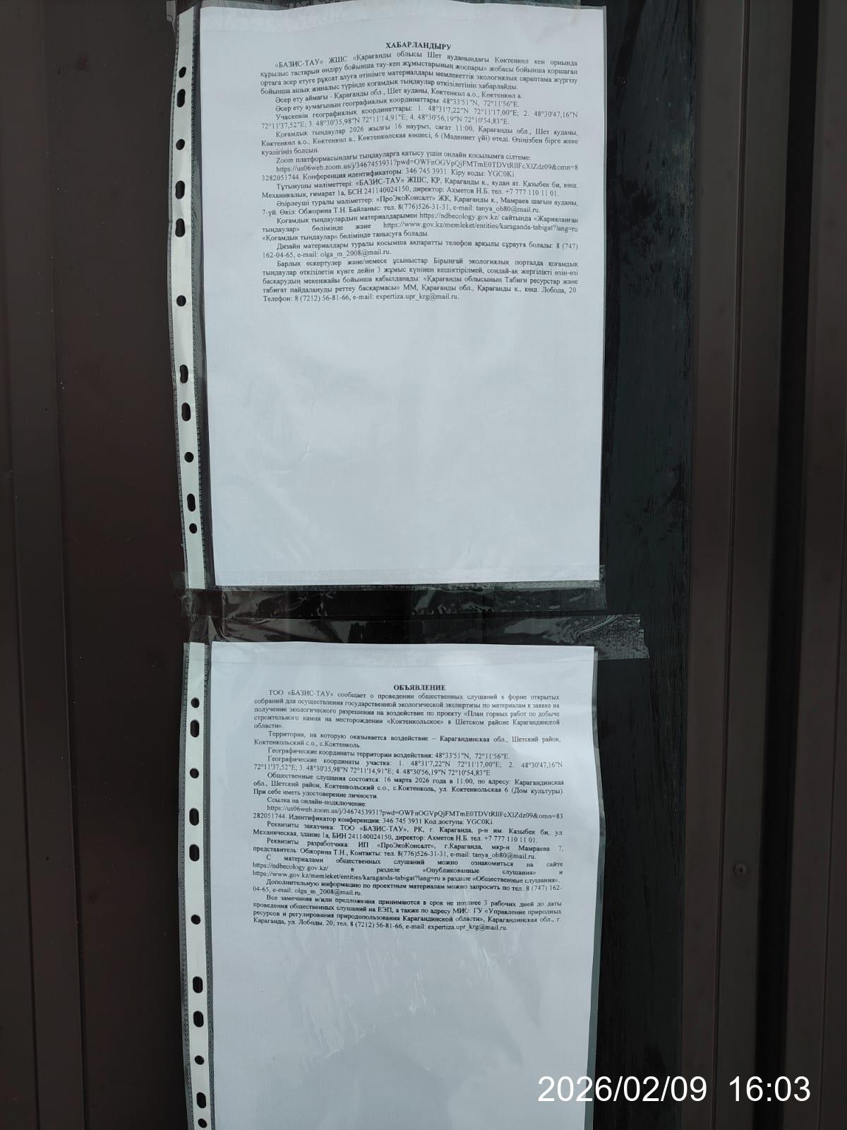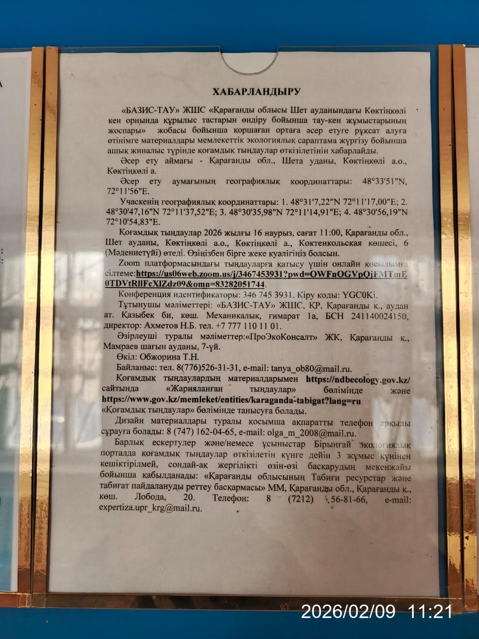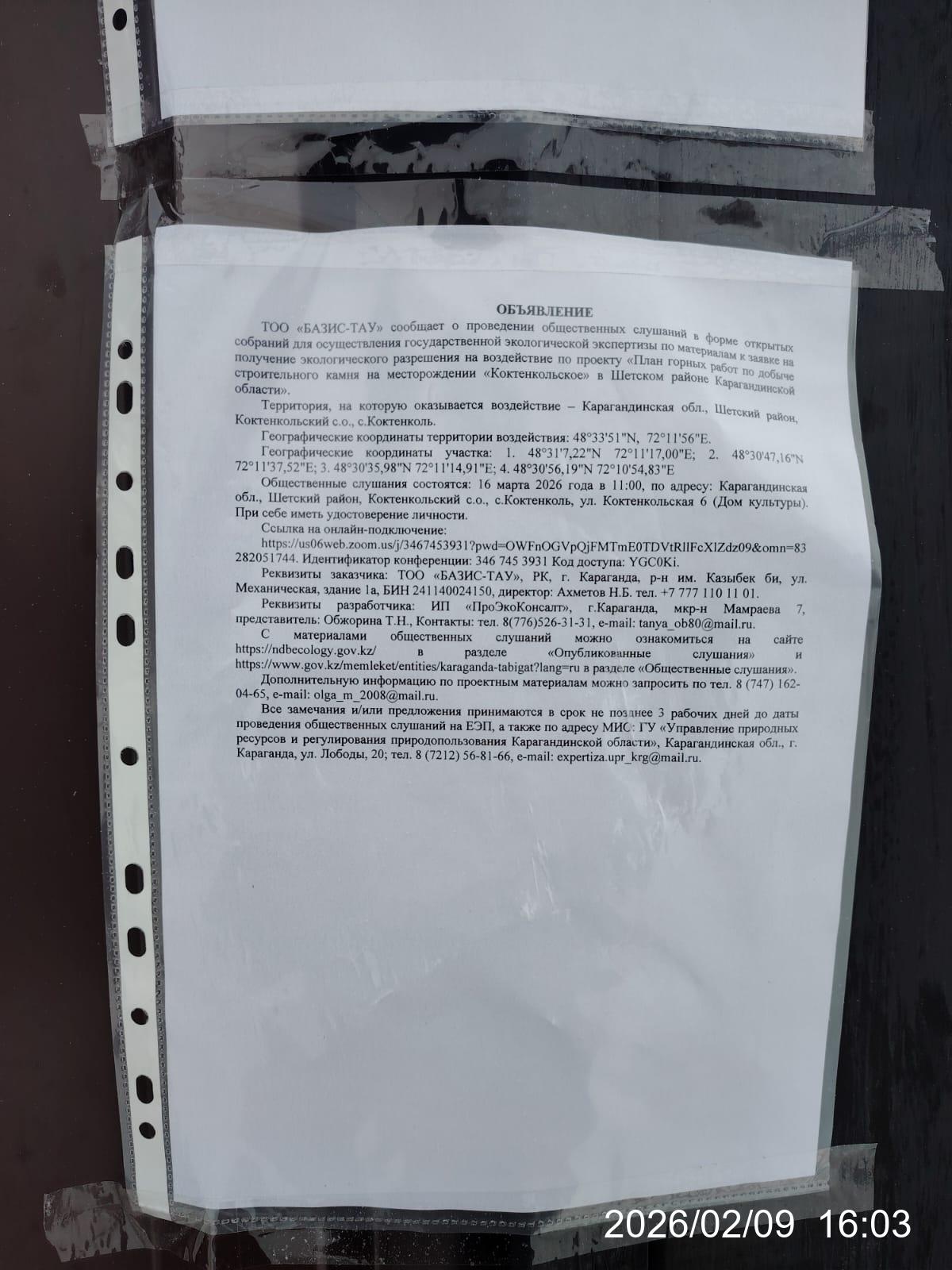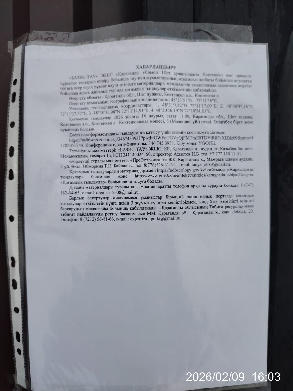 3. Общественные слушания организованны: Управление природных ресурсов и регулирования природопользования Карагандинской области, expertiza.upr_krg@mail.ru,