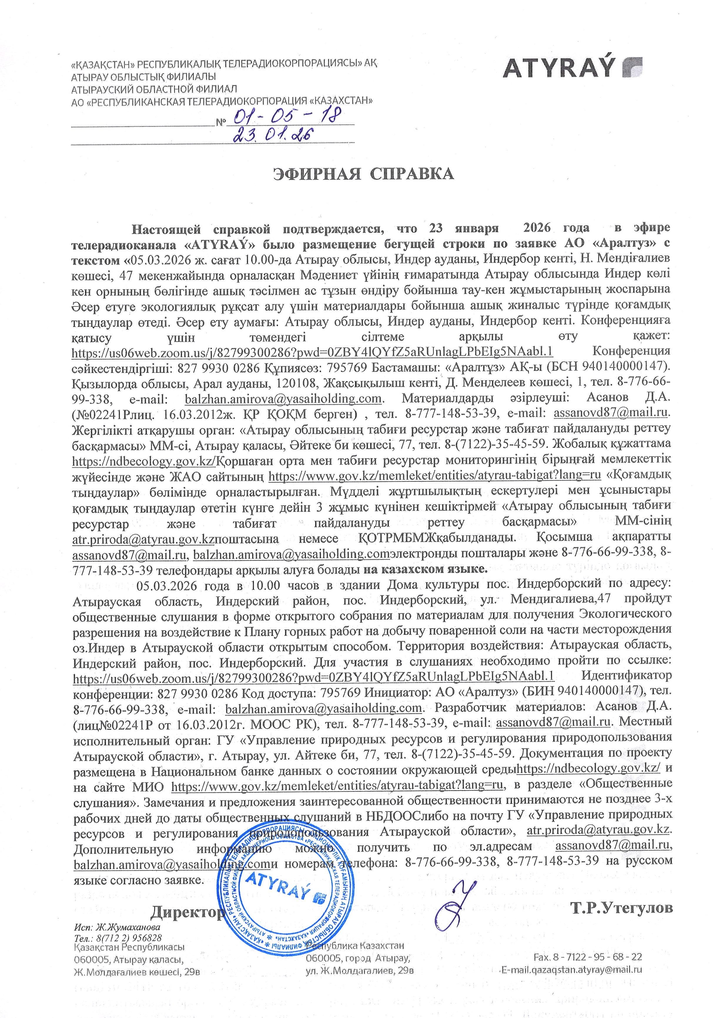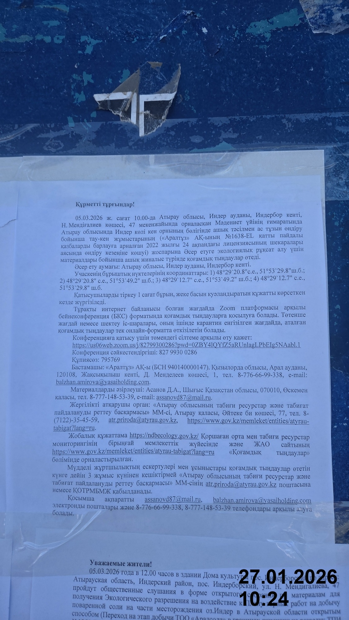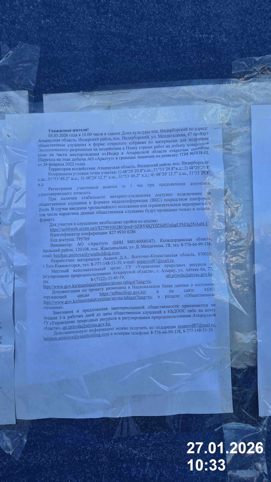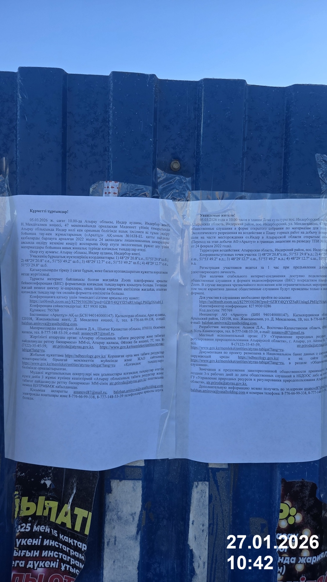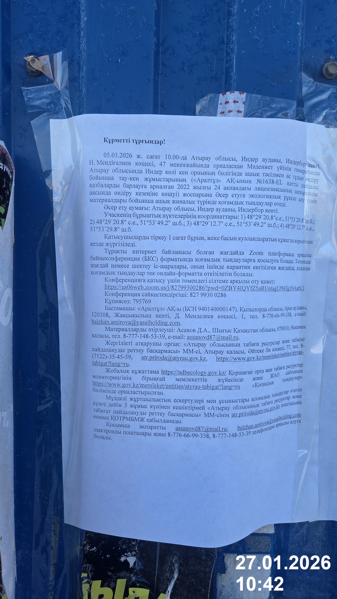 3. Общественные слушания организованны: Управление природных ресурсов и регулирования природопользования Атырауской области, atr.priroda@atyrau.gov.kz,