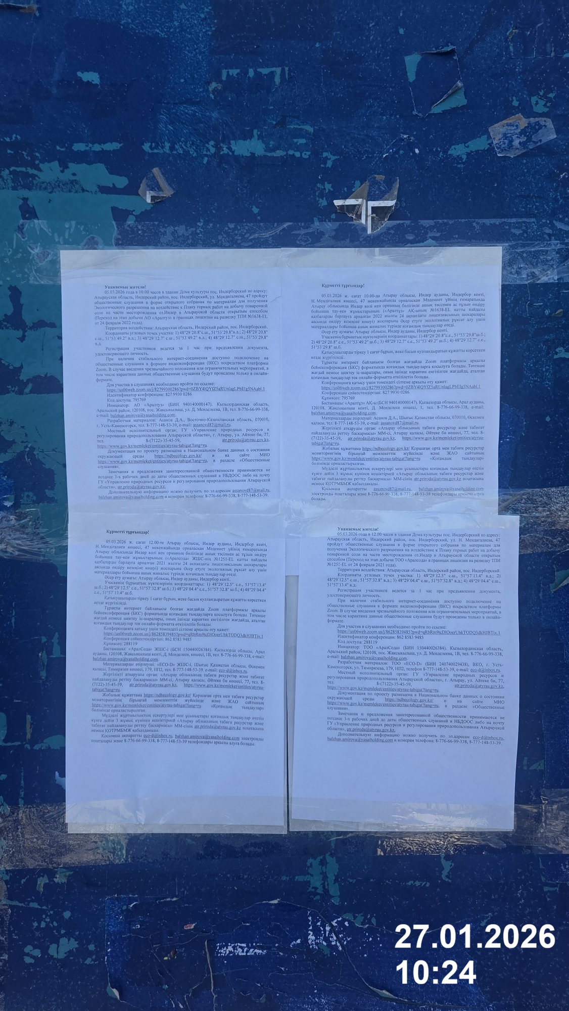1.2. Место проведения: Атырауская область, Индерский район, Индерборская п.а., п.Индерборский, ул. Н. Мендигалиева, 47, а также онлайн посредством ЗУМ по ссылке: https://us06web.zoom.us/j/82799300286?pwd=0ZBY4lQYfZ5aRUnlagLPbEIg5NAabl.1 Идентификатор конференции: 827 9930 0286 Код доступа: 795769