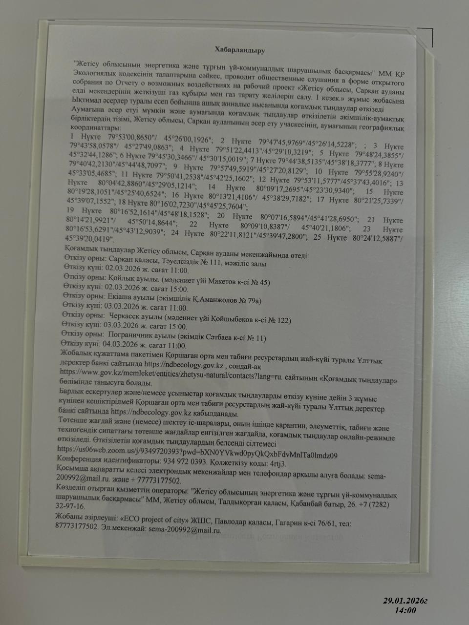 3. Общественные слушания организованны: Главный специалист УПР и ПР Жетысуйской области, priroda@zhetisu.gov.kz,