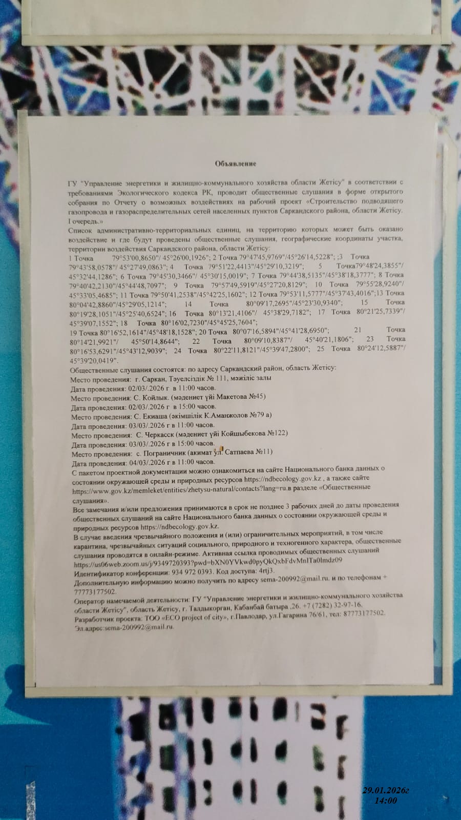 3. Общественные слушания организованны: Главный специалист УПР и ПР Жетысуйской области, priroda@zhetisu.gov.kz,