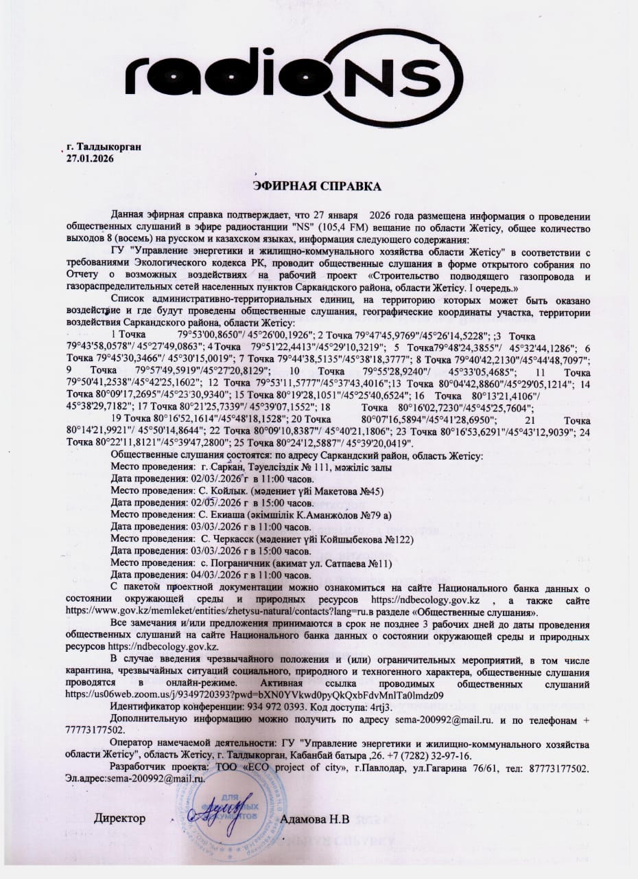 По проекту: Отчет о возможных воздействиях на рабочий проект «Строительство подводящего газопровода и газораспределительных сетей населенных пунктов Саркандского района, области Жетісу. I очередь.»