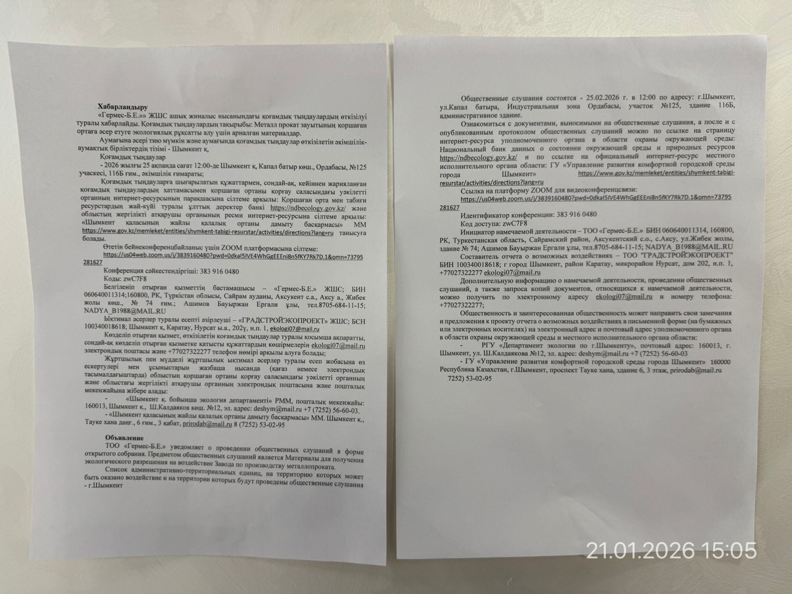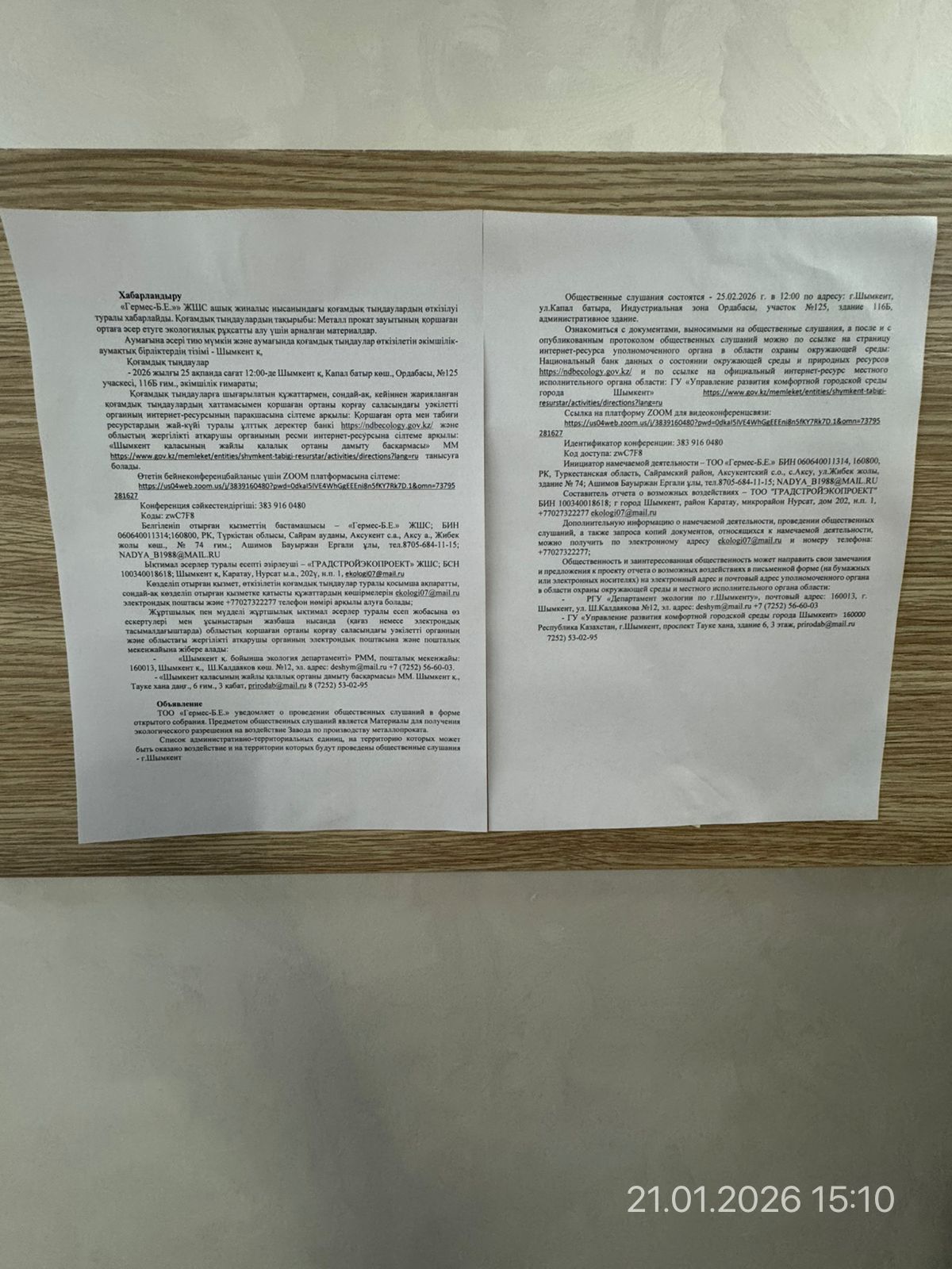 3. Общественные слушания организованны: Управление развития комфортной городской среды г.Шымкент, g.ermekbaeva@shymkent.gov.kz,