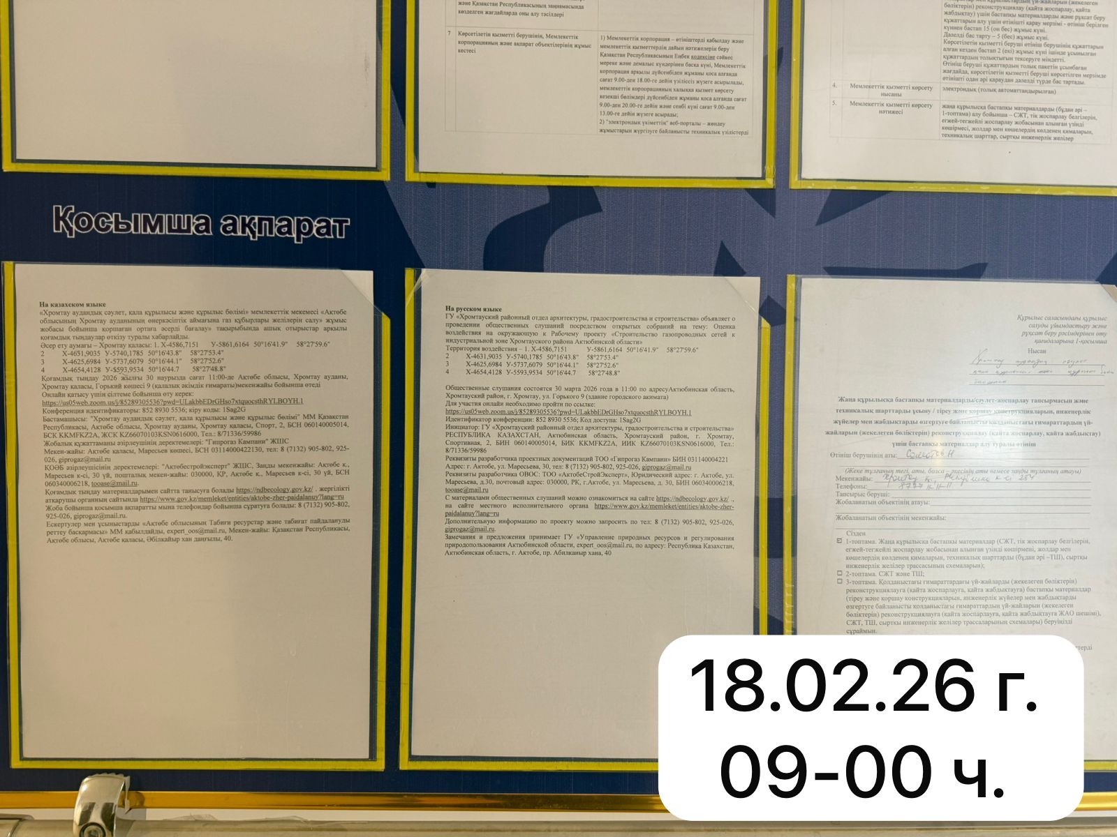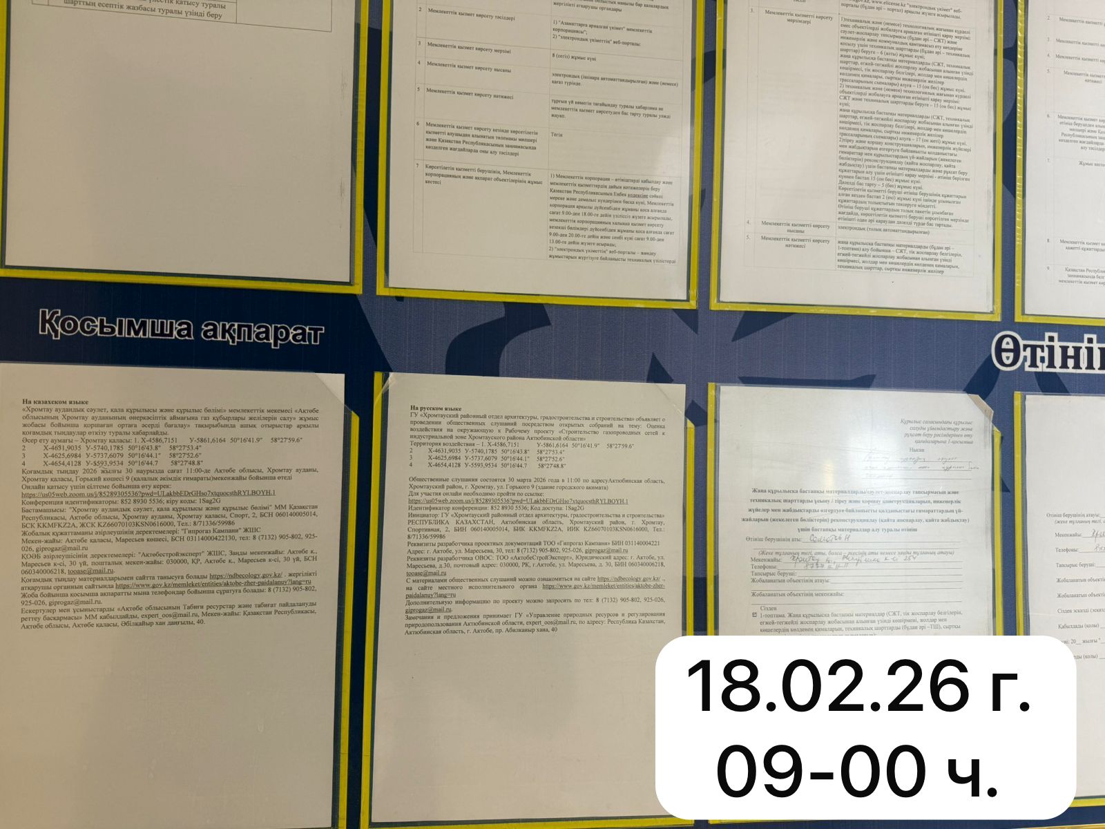 6.3. расположение мест, специально предназначенных для Размещения печатных объявлений (доски объявлений): Актюбинская область, Хромтауский район, г. Хромтау, ул. Горького 9 (здание городского акимата)