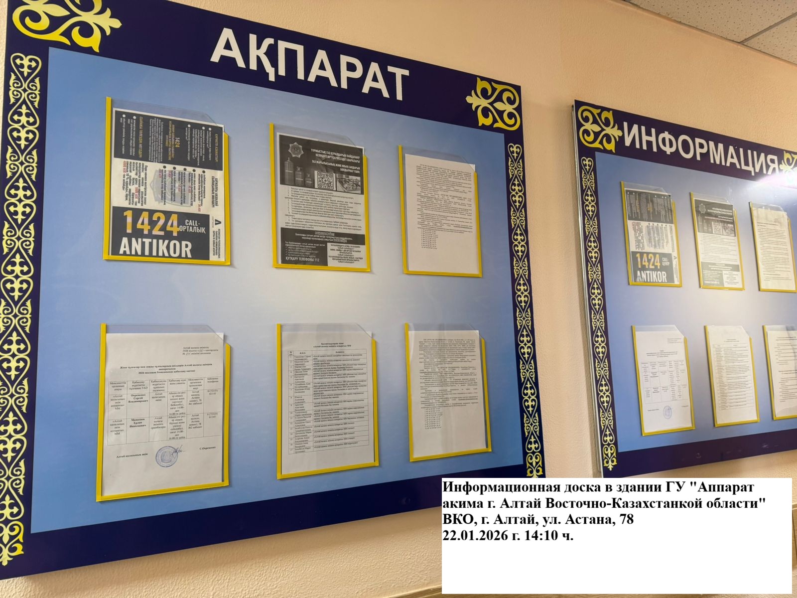 6.3. расположение мест, специально предназначенных для Размещения печатных объявлений (доски объявлений): Здание ГУ "Аппарат акима г. Алтай"