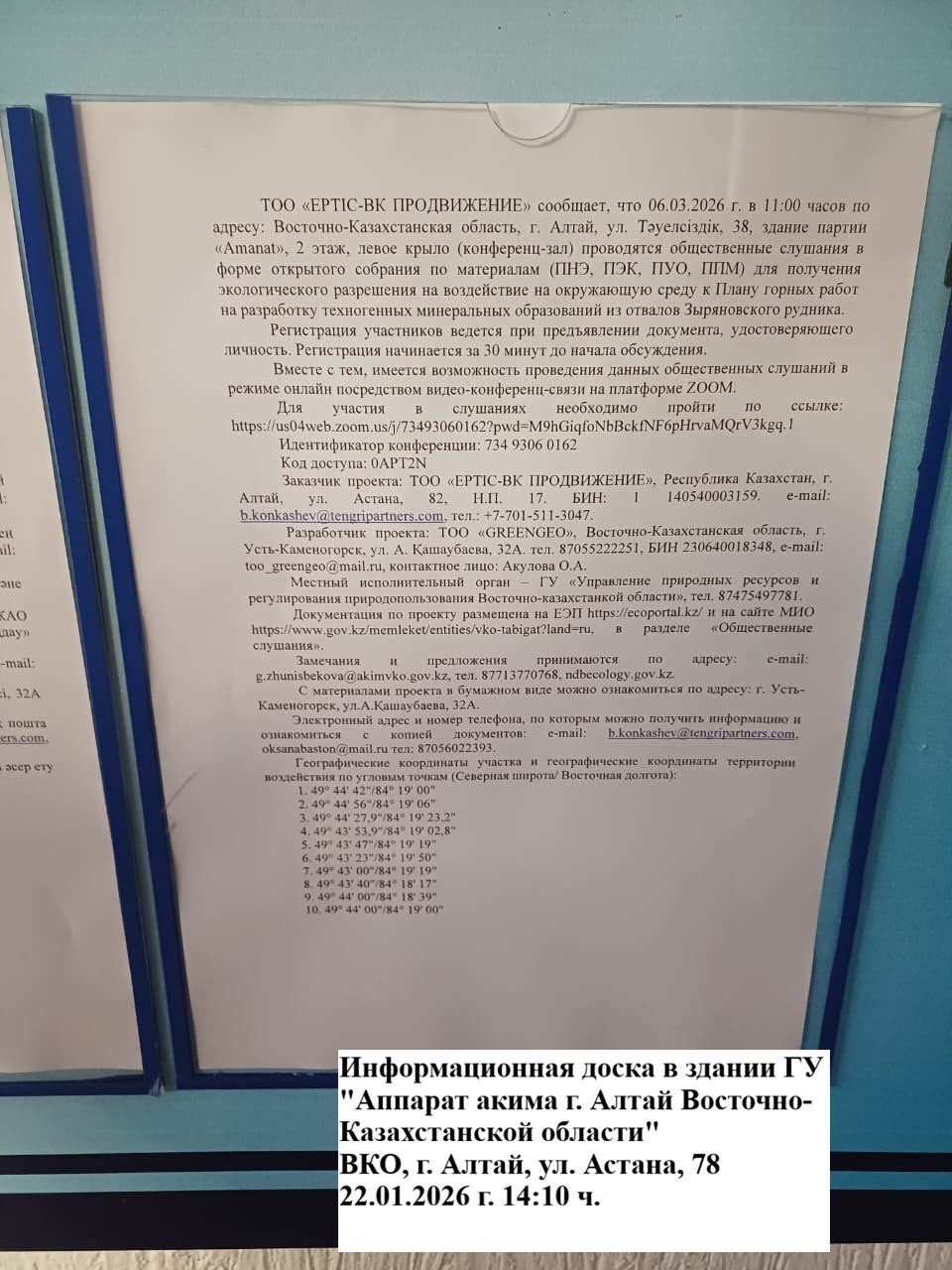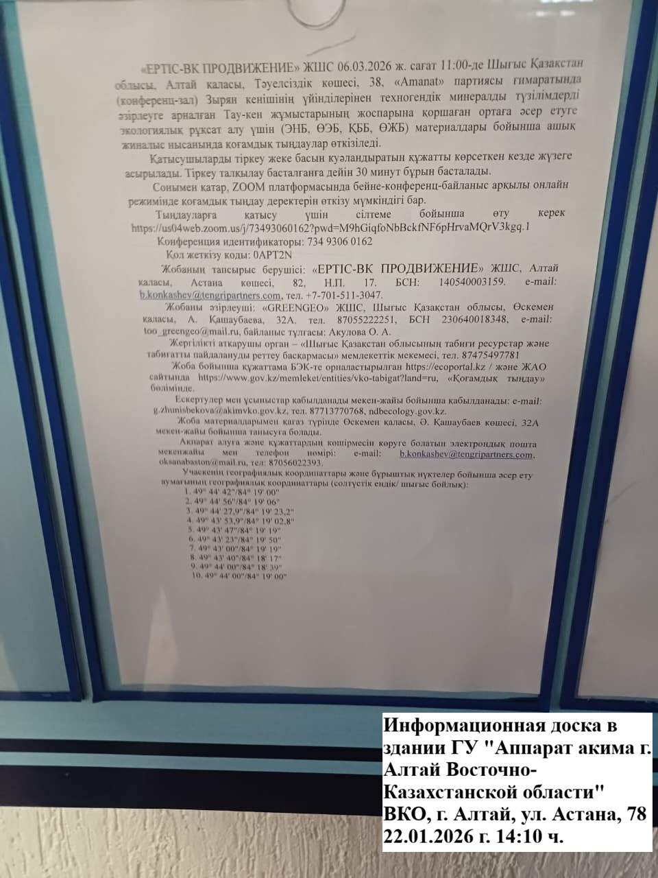 3. Общественные слушания организованны: Управление природных ресурсов и регулирования природопользования Восточно-Казахстанской области, g.zhunisbekova@akimvko.gov.kz,