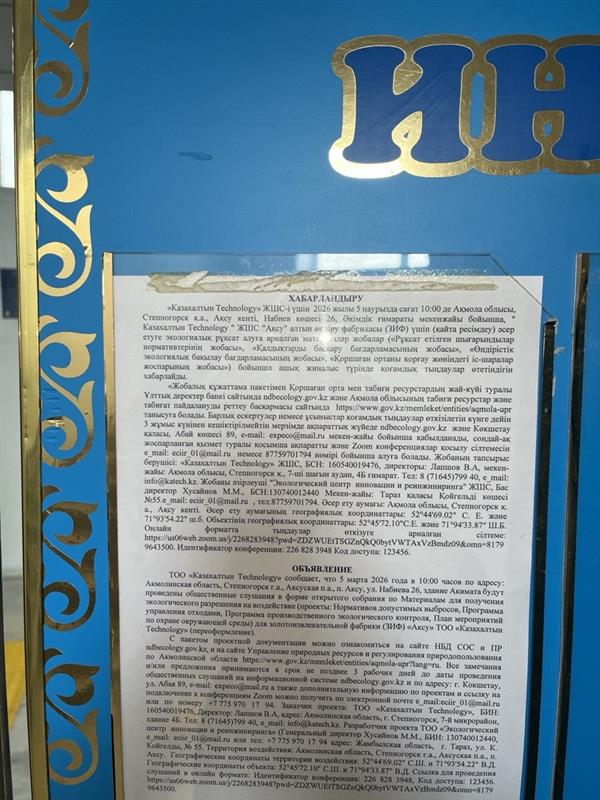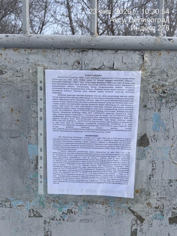 По проекту: Материалы для получения экологического разрешения на воздействие (проекты: Нормативов допустимых выбросов, Программа управления отходами, Программа производственного экологического контроля, План мероприятий по охране окружающей среды) для золотоизвлекательной фабрики (ЗИФ) «Аксу» ТОО «Казахалтын Technology» (переоформление).