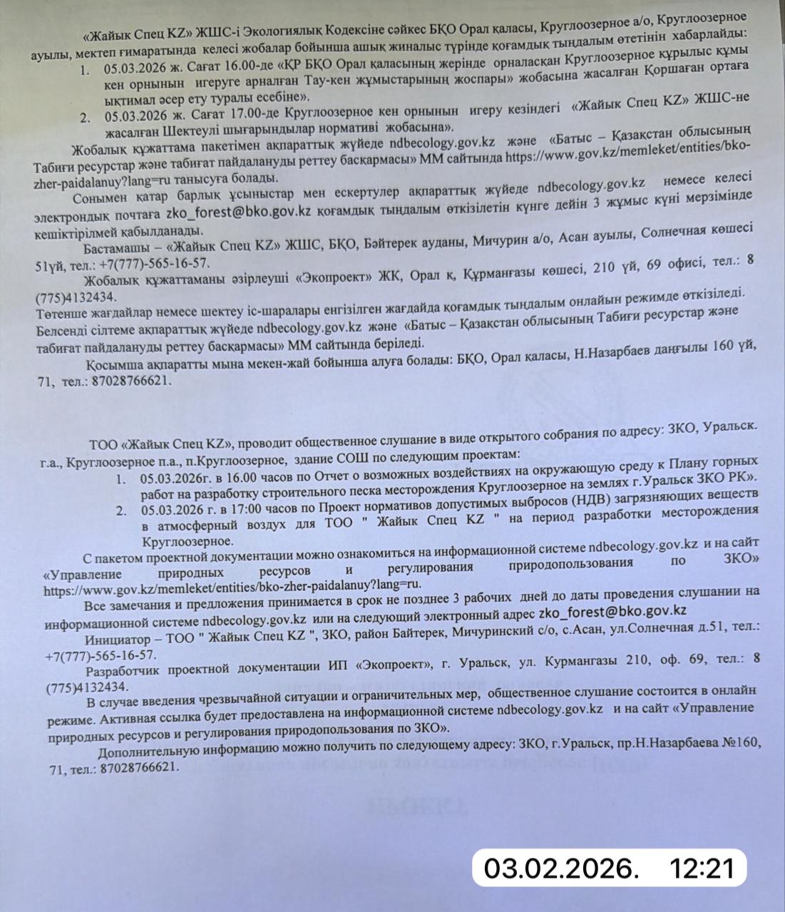 3. Общественные слушания организованны: Управление природных ресурсов и регулирования природопользования Западно-Казахстанской области, zko_forest@bko.gov.kz,