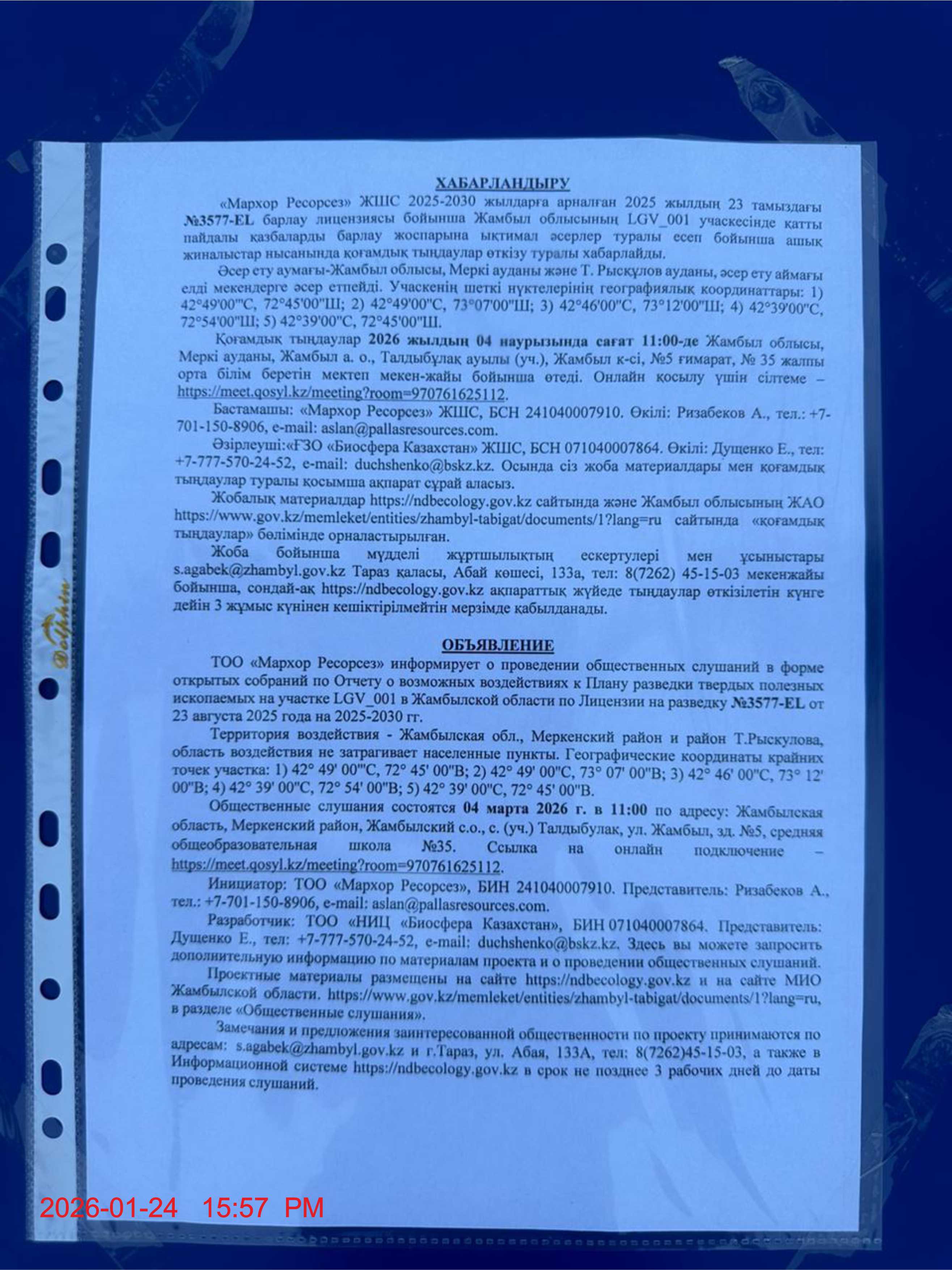 3. Общественные слушания организованны: Управление природных ресурсов и регулирования природопользования Жамбылской области, s.agabek@zhambyl.gov.kz,
