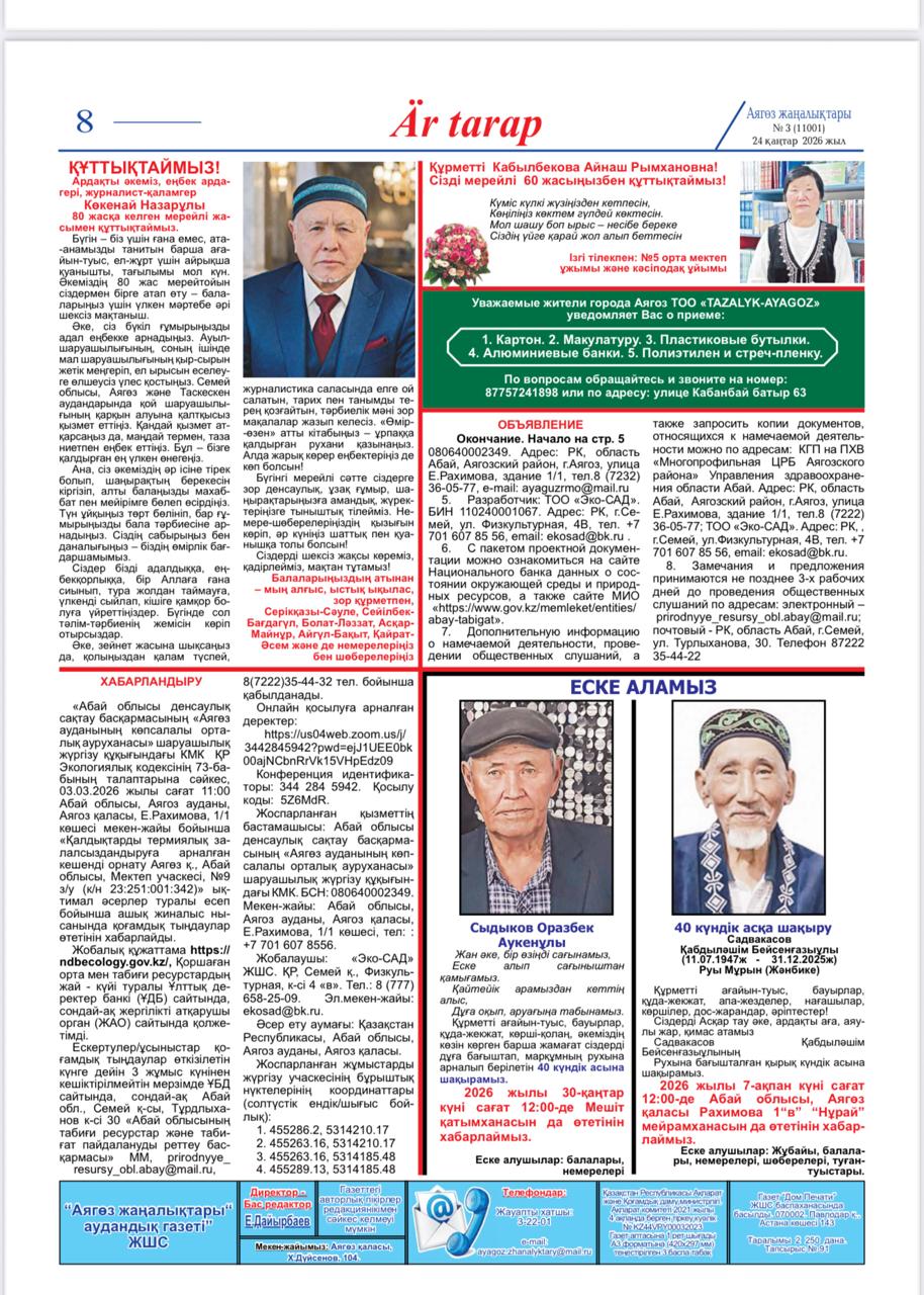 6.1. Наименование газеты, где будет размещено объявление: Аягоз Жаналыктары