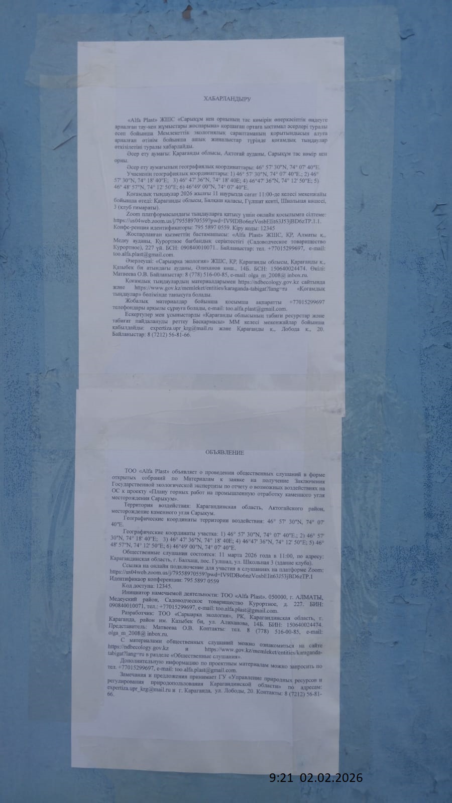 3. Общественные слушания организованны: Управление природных ресурсов и регулирования природопользования Карагандинской области, expertiza.upr_krg@mail.ru,
