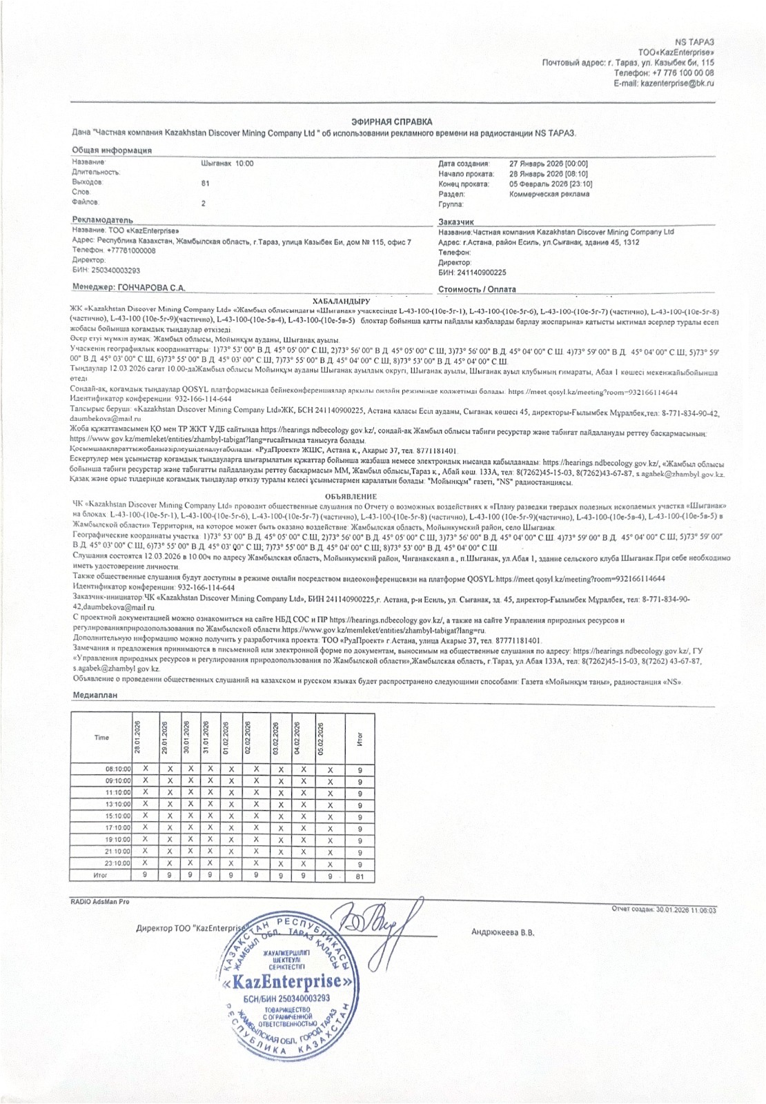 1.4. Описание для подключения к онлайн трансляции при прохождении общественного слушания: Приглашение на запланированную встречу в Qosyl Тема встречи: Частная компания «Kazakhstan Discover Mining Company Ltd» Время встречи: 12.03.2026 10:00 Длительность встречи: 01 час. Идентификатор встречи: 932-166-114-644 Подключиться к встрече в Qosyl: https://meet.qosyl.kz/meeting?room=932166114644