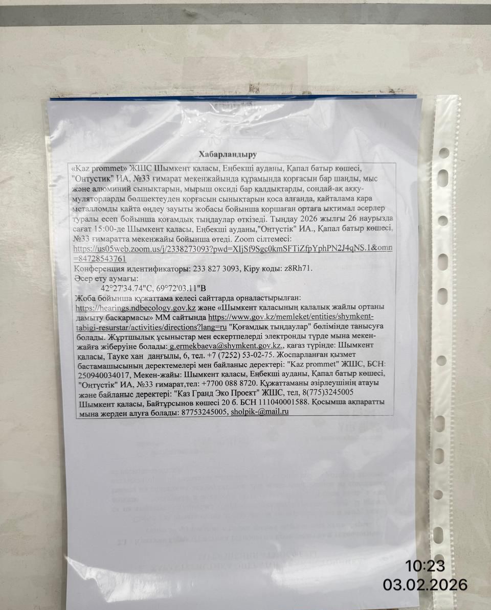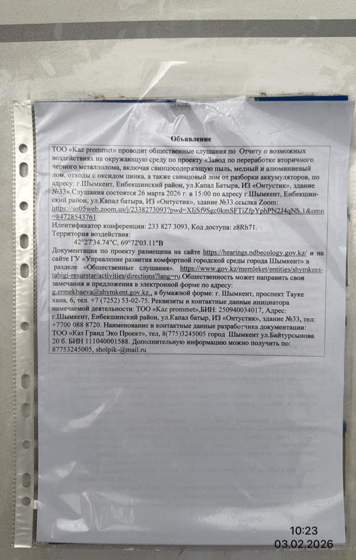 4. Повестка дня общественных слушаний: Завод по переработке вторичного черного металлолома, включая cвинцосодержащую пыль, медный и алюминиевый лом, отходы с оксидом цинка, а также свинцовый лом от разборки аккумуляторов расположена по адресу: г.Шымкент, Енбекшинский район, ул.Капал батыра, ИЗ «Онтустик», здание №33. Данная территория относится к промышленной зоне. Кадастровый номер земельного участка 19-309-049-367 с площадью 0,1006 га. Целевое назначение участка: под существующее здание. Территория завода находится в аренде у ИП «Әдина Р» на основании договора аренды №2084 от 02.10.2025 года и действующий по сей день. Площадь существующего производственного здания составляет 1020,9 м2, если включать всю территорию, то общая площадь земельного участка составляет 0,1006 га. На территории участка расположены: бетоннированная площадка для временного хранения лома и отходов черных и цветных металлов, здания производственного цеха со складом готовых продуктов. Территория завода граничит: с севера и востока – с территориями производственных объектов индустриальной зоны, с юга – с внутренной автодорогой индустриальной зоны, далее на расстояний 13 метров с территорией производственного объекта, с запада – с внутренной автодорогой индустриальной зоны, далее на расстояний 20 метров с территорией производственного объекта, за территорией производственного объекта на расстояний 70 метров расположена производственная площадка ТОО «TectumEngineering». Ближайшая жилая застройка расположена на расстоянии более 1600 м от территории участка с восточной стороны. Ближайший поверхностный водный объект, река Сайрамсу протекает с северной стороны на расстоянии более 600 м. Территория объекта не входит в водоохранную зону. На отведенном участке не имеются зеленые насаждения.
