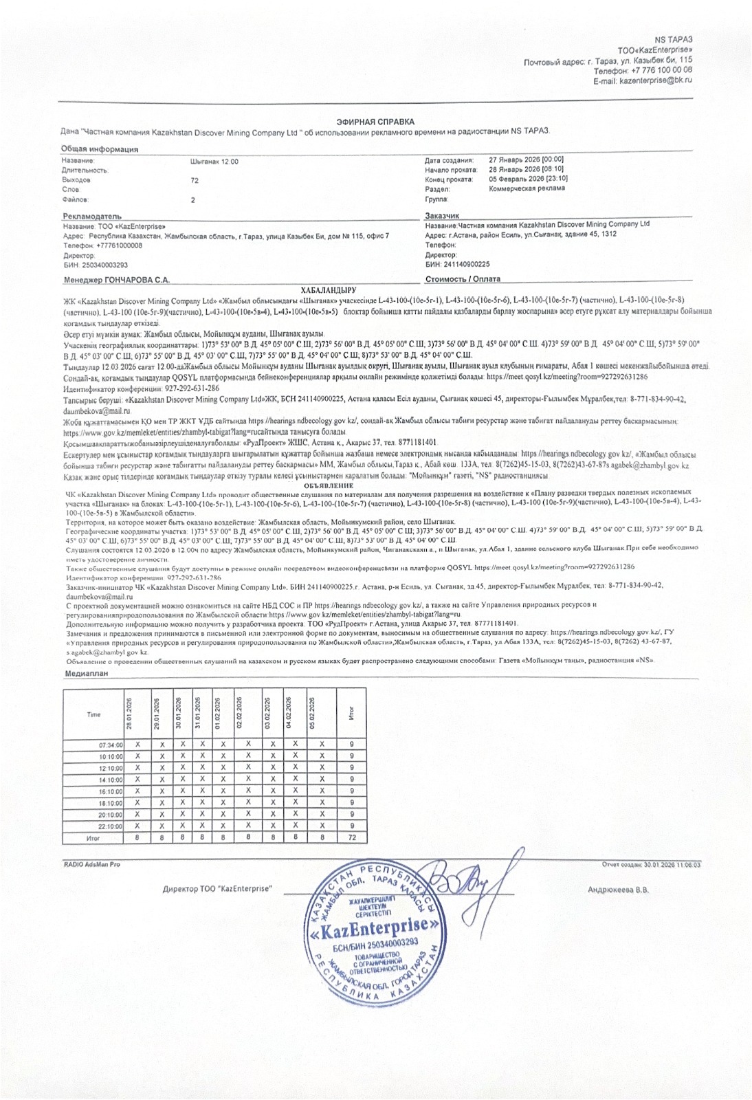 Подтверждающий документ о своевременном размещении объявления о проведении общественных слушаний не менее чем в одном теле- или радиоканале