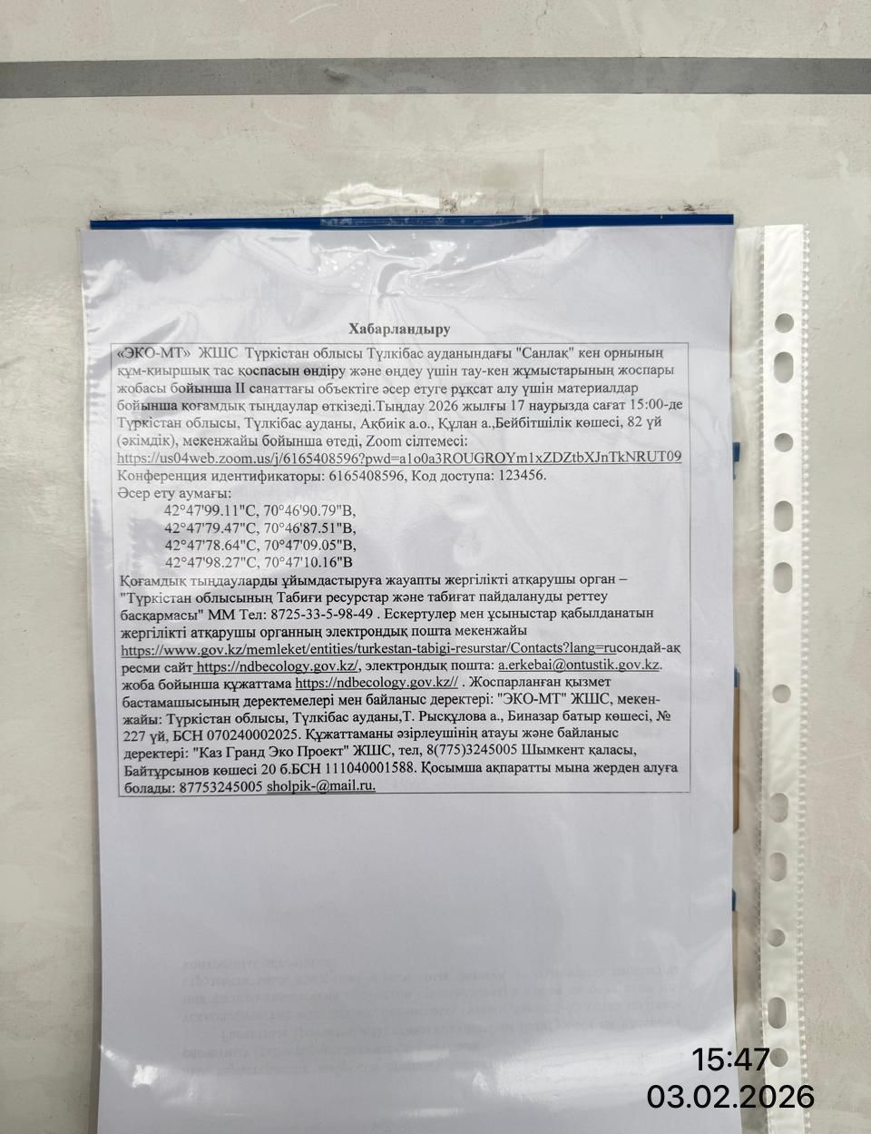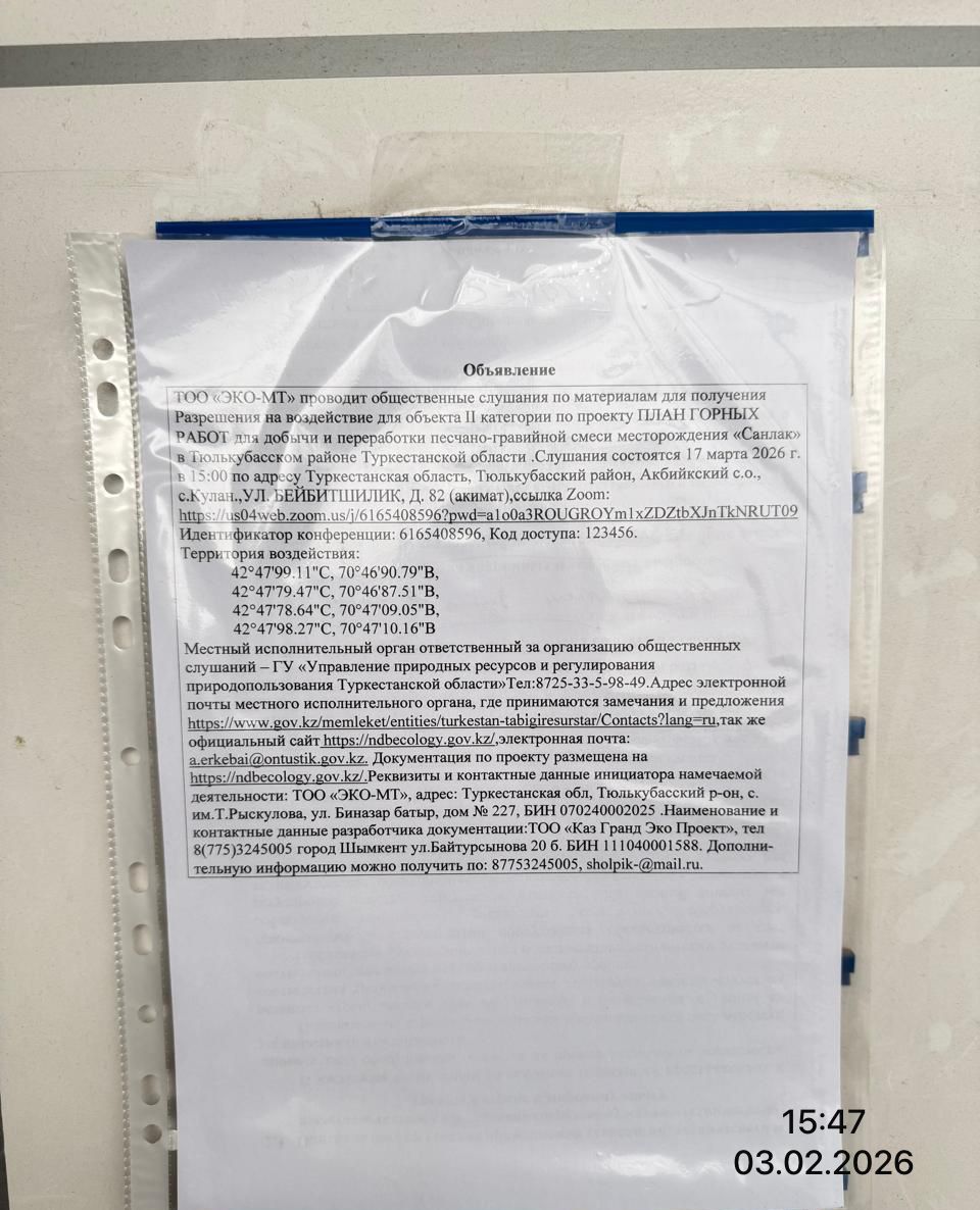 3. Общественные слушания организованны: Управление природных ресурсов и регулирования природопользования Туркестанской области, a.erkebai@ontustik.gov.kz,