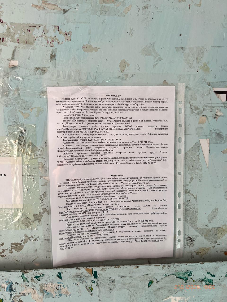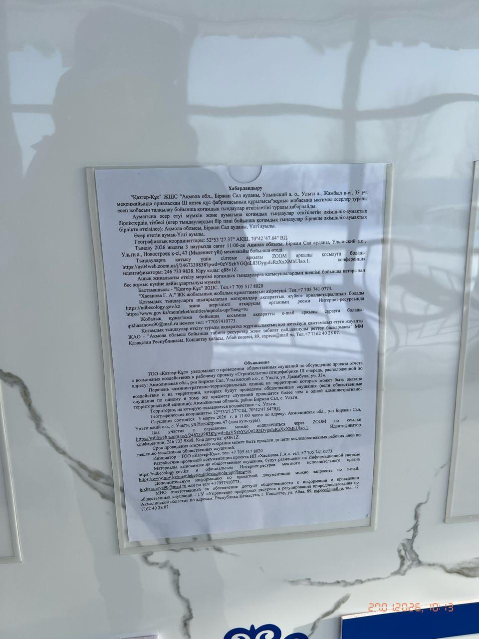 1.2. Место проведения: Акмолинская обл., р-н Биржан Сал, Ульгинский с.о., с. Ульги, ул Новостроек 47 (дом культуры). Для участия в слушаниях можно подключиться через ZOOM по ссылке https://us04web.zoom.us/j/2467339838?pwd=0zVSzbYGQnL83DyguIcRzXxXMhUlao.1. Идентификатор конференции: 246 733 9838. Код доступа: q88v1Z.