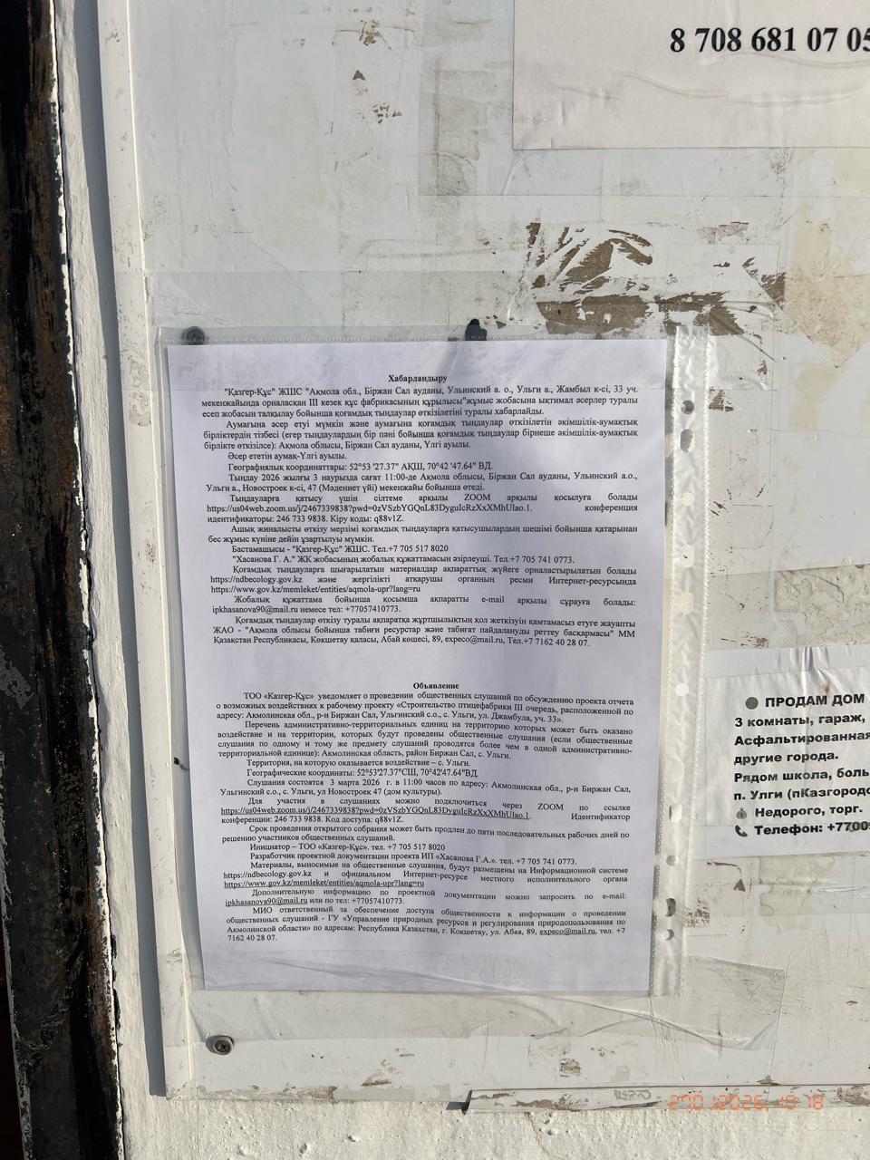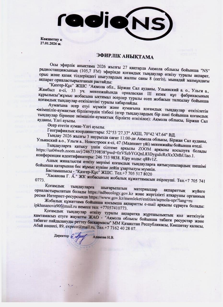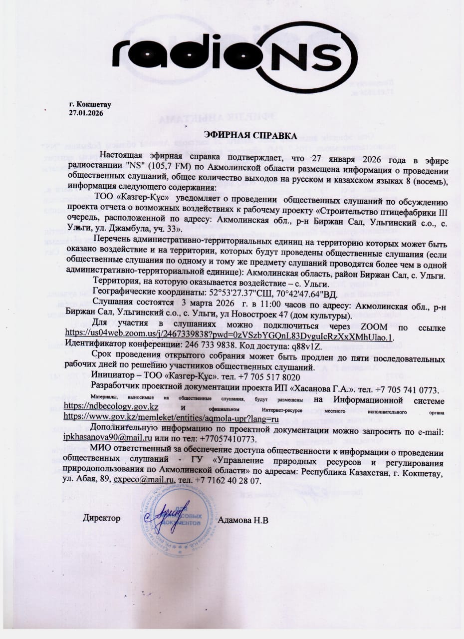 По проекту: Проект отчета о возможных воздействиях к рабочему проекту «Строительство птицефабрики III очередь, расположенной по адресу: Акмолинская обл., р-н Биржан Сал, Ульгинский с.о., с. Ульги, ул. Джамбула, уч. 33».