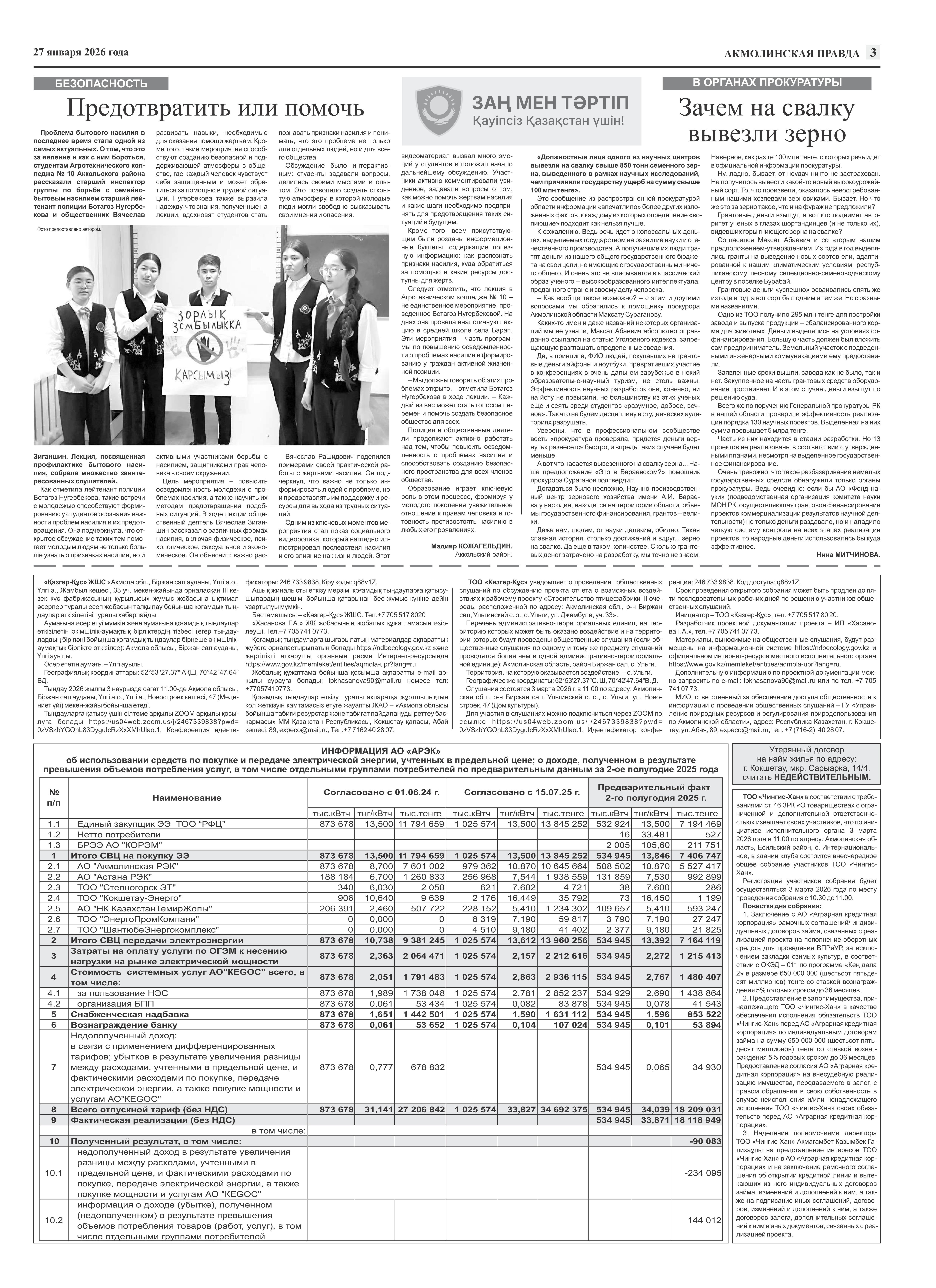 6.1. Наименование газеты, где будет размещено объявление: областная газета "Акмолинская правда" "Арка Ажары"