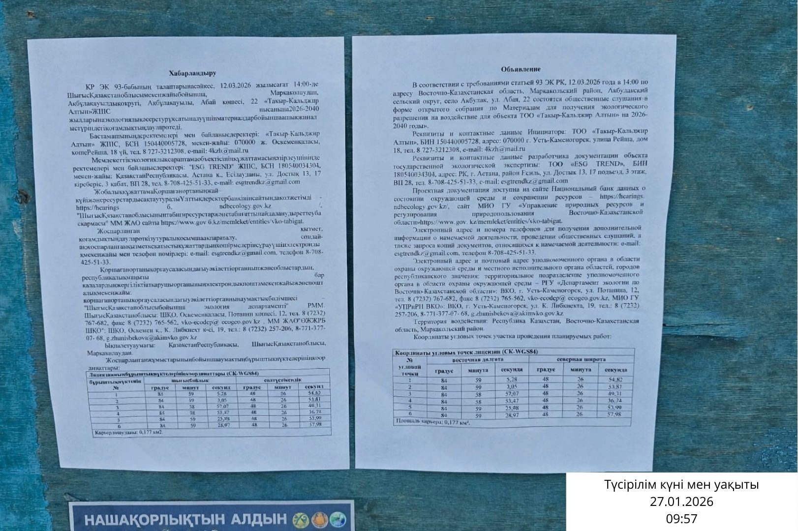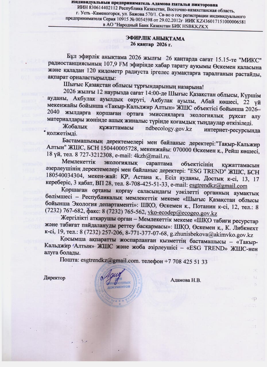 3. Общественные слушания организованны: Управление природных ресурсов и регулирования природопользования Восточно-Казахстанской области, g.zhunisbekova@akimvko.gov.kz,