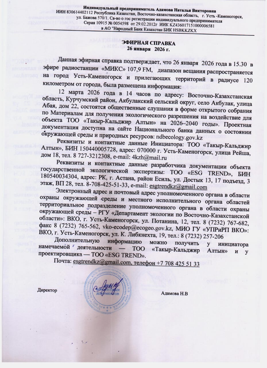 По проекту: Материалы для получения экологического разрешения на воздействие для объекта ТОО "Такыр-Кальджир Алтын"