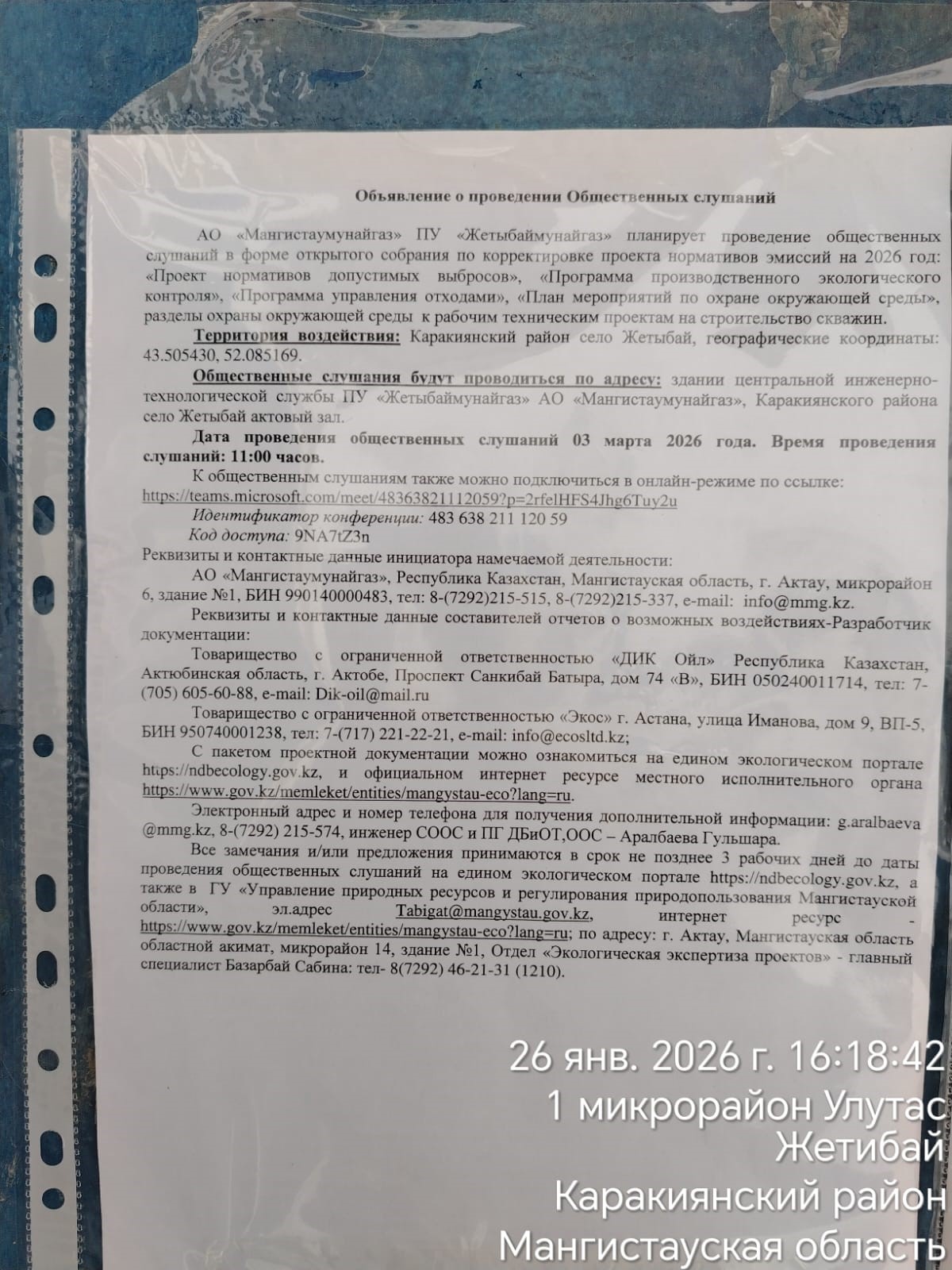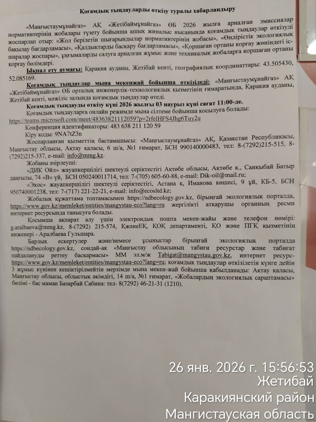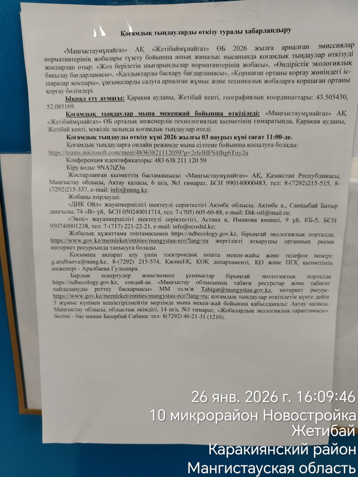 По проекту: АО «Мангистаумунайгаз» ПУ «Жетыбаймунайгаз» планирует проведение общественных слушаний в форме открытого собрания по корректировке проекта нормативов эмиссий на 2026 год: «Проект нормативов допустимых выбросов», «Программа производственного экологического контроля», «Программа управления отходами», «План мероприятий по охране окружающей среды», разделы охраны окружающей среды к рабочим техническим проектам на строительство скважин.