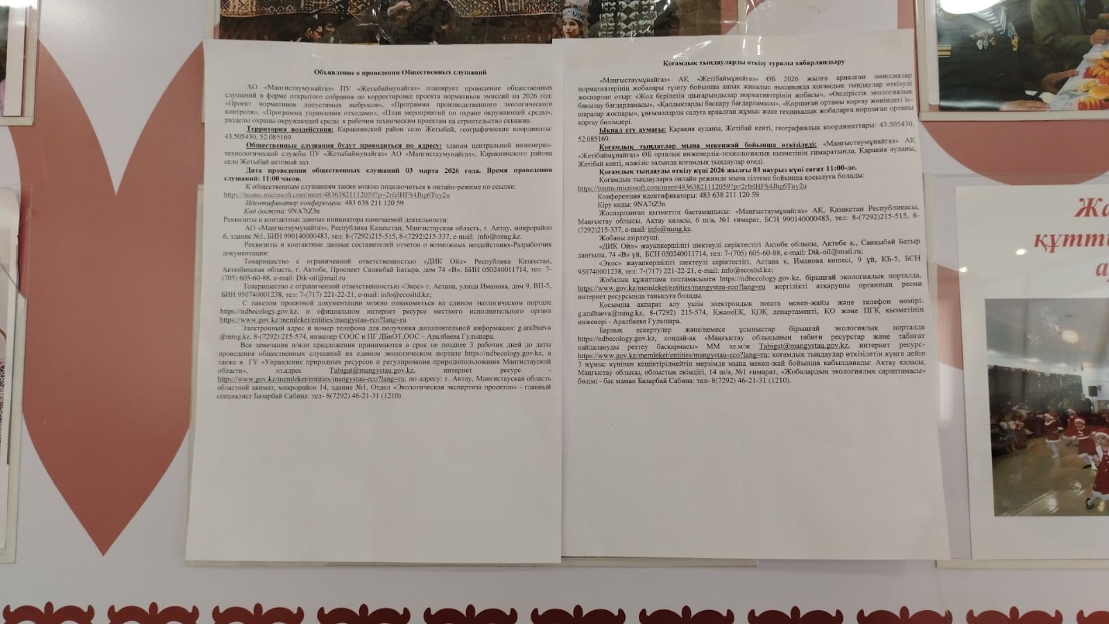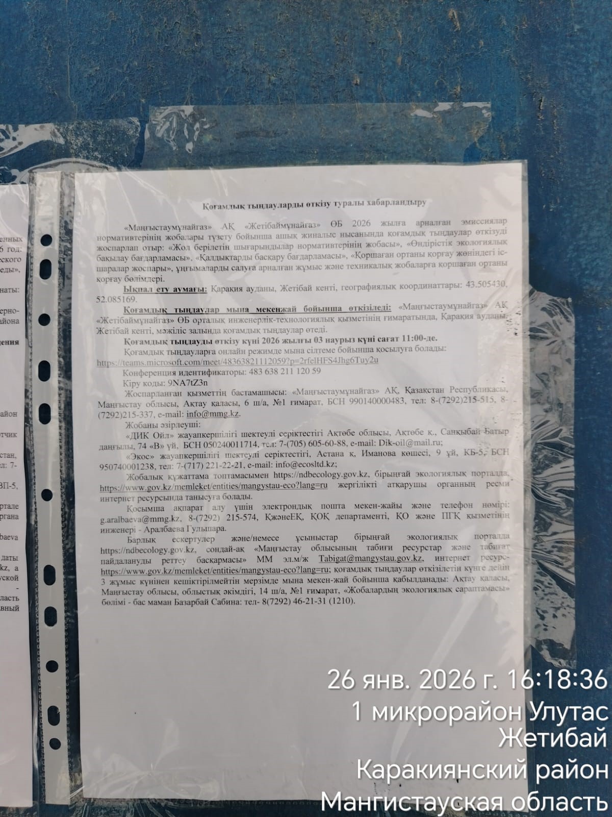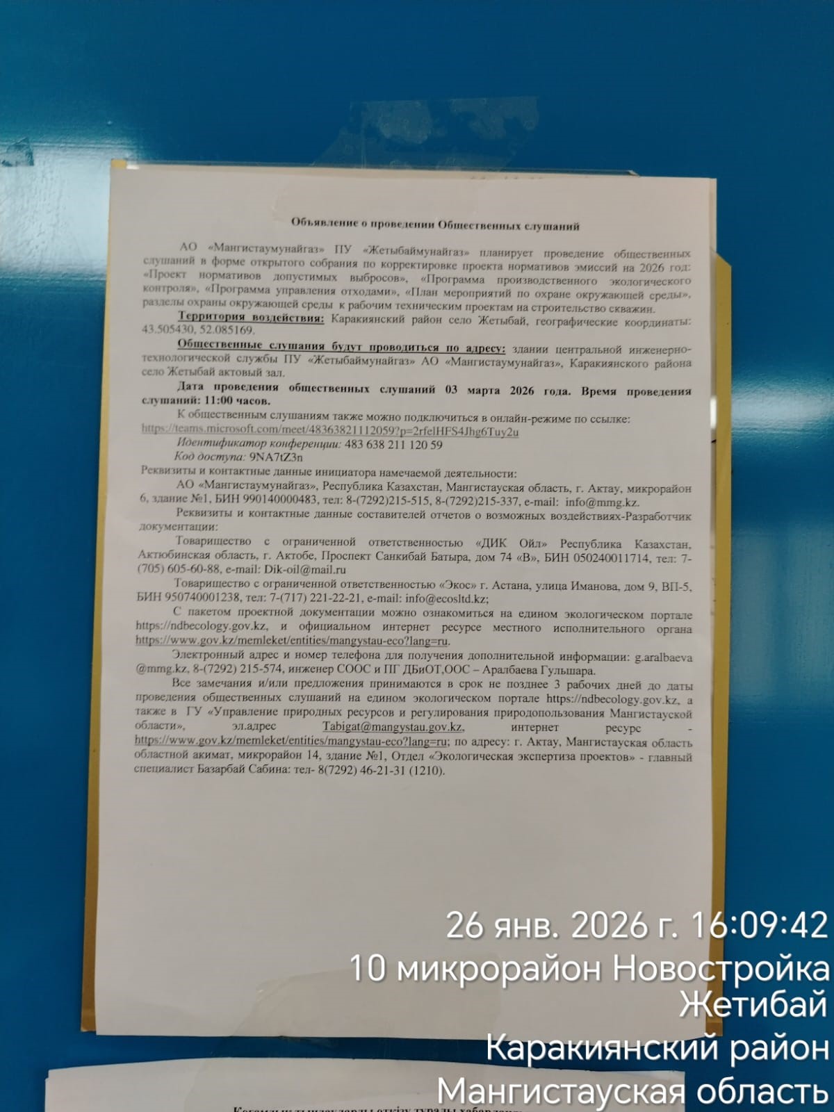 По проекту: АО «Мангистаумунайгаз» ПУ «Жетыбаймунайгаз» планирует проведение общественных слушаний в форме открытого собрания по корректировке проекта нормативов эмиссий на 2026 год: «Проект нормативов допустимых выбросов», «Программа производственного экологического контроля», «Программа управления отходами», «План мероприятий по охране окружающей среды», разделы охраны окружающей среды к рабочим техническим проектам на строительство скважин.