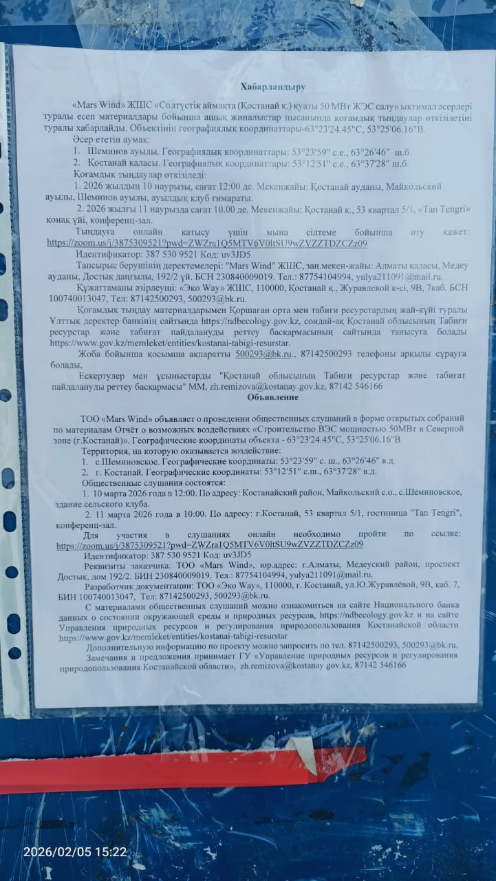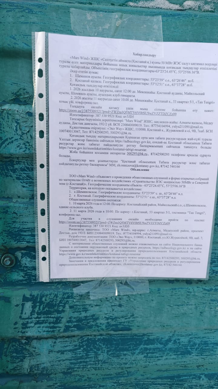 3. Общественные слушания организованны: Управление природных ресурсов и регулирования природопользования Костанайской области, zh.remizova@kostanay.gov.kz, 87142 546166,
