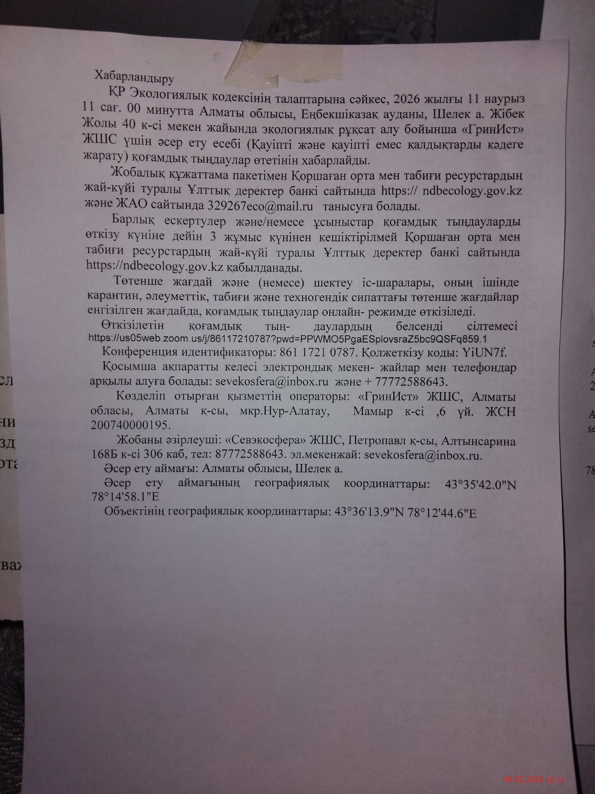 3. Общественные слушания организованны: Управление природных ресурсов и регулирования природопользования Алматинской области, 329267eco@mail.ru,