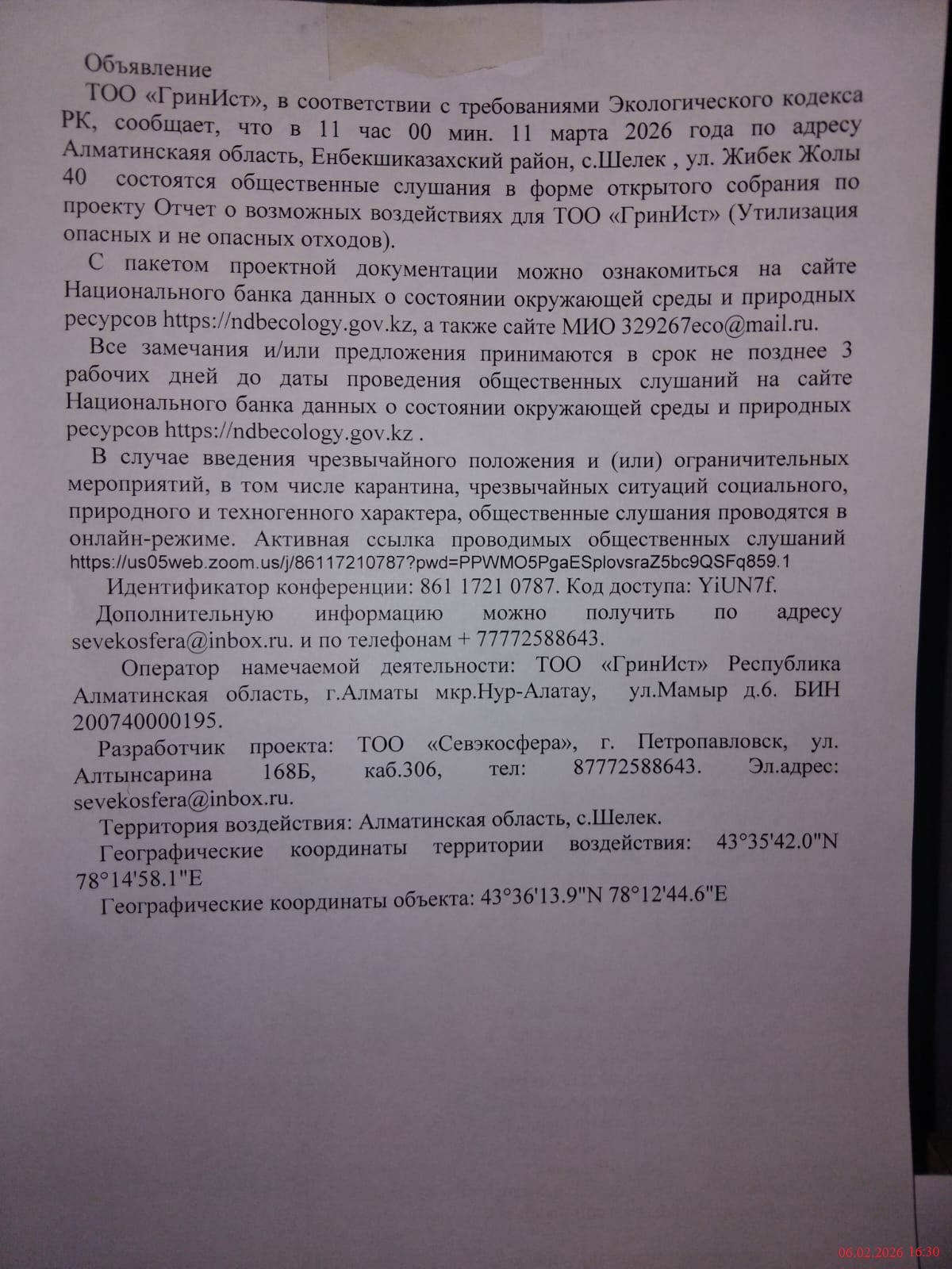 1.3. Контакты:mv_arn@mail.ru; https://hearings.ndbecology.gov.kz/;