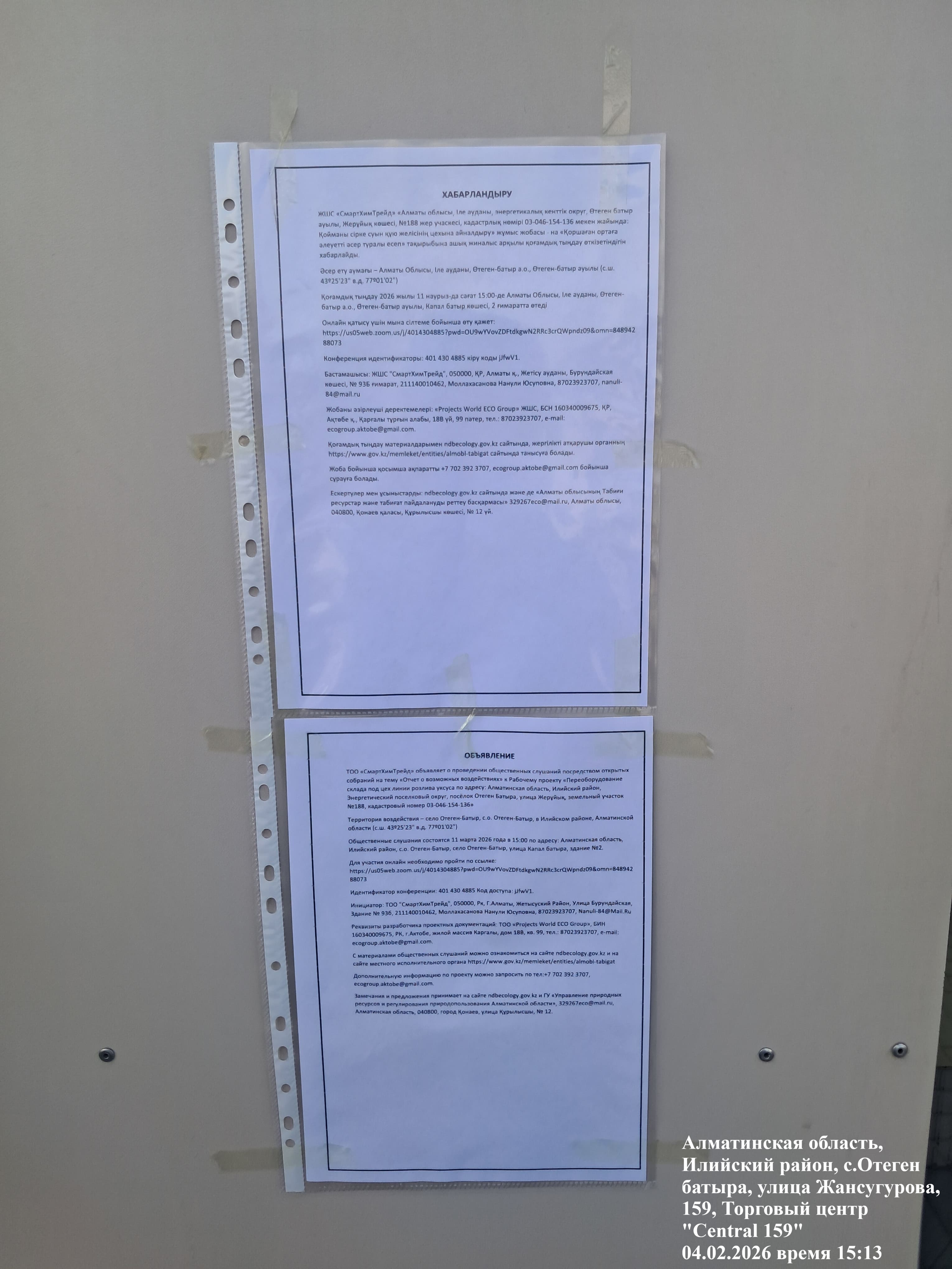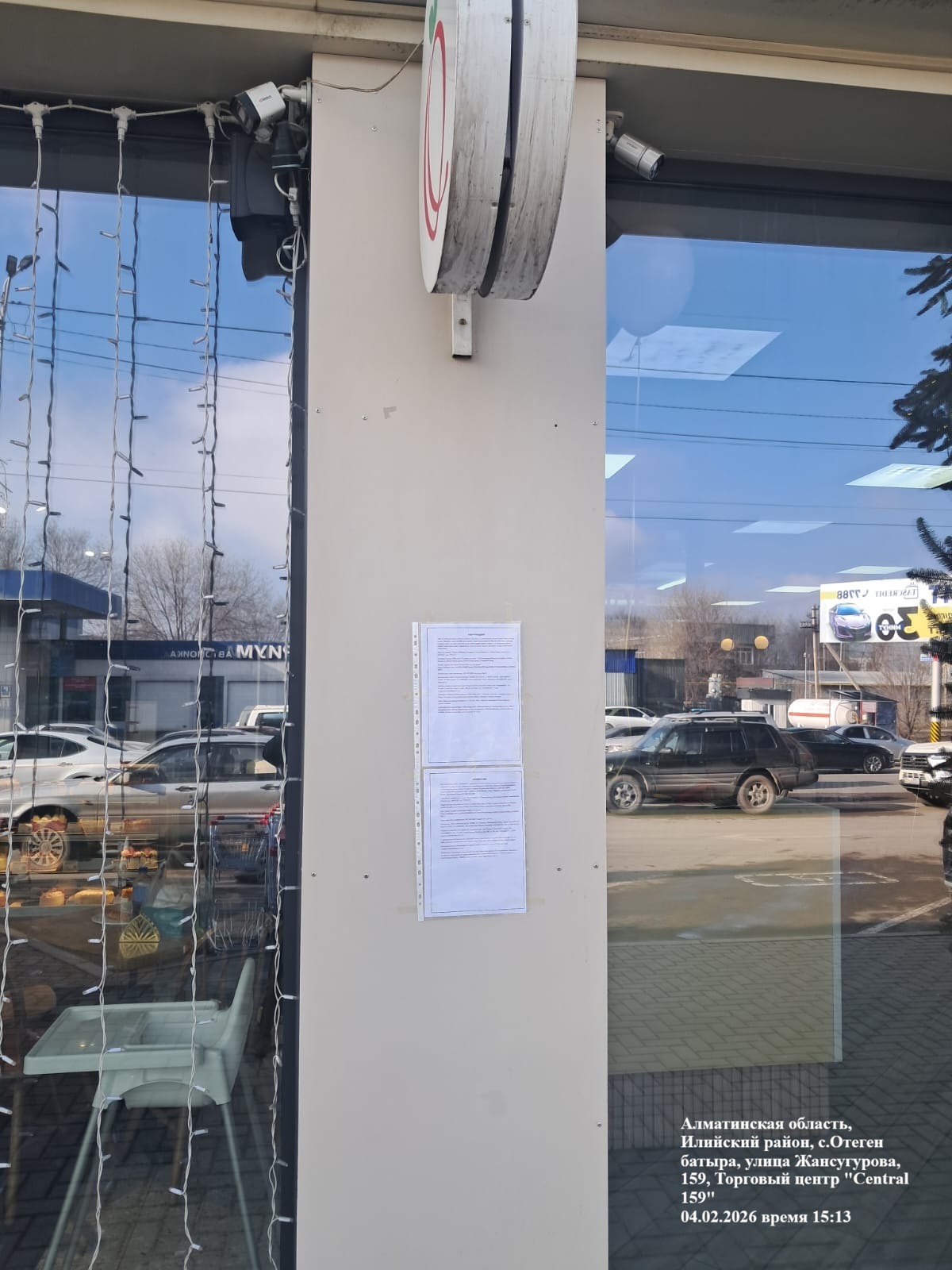 6.3. расположение мест, специально предназначенных для Размещения печатных объявлений (доски объявлений): Алматинская область, Илийский район, с.Отеген батыра, улица Жансугурова, 159, Торговый центр "Central 159"