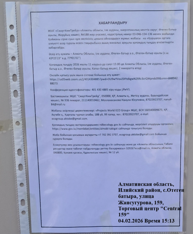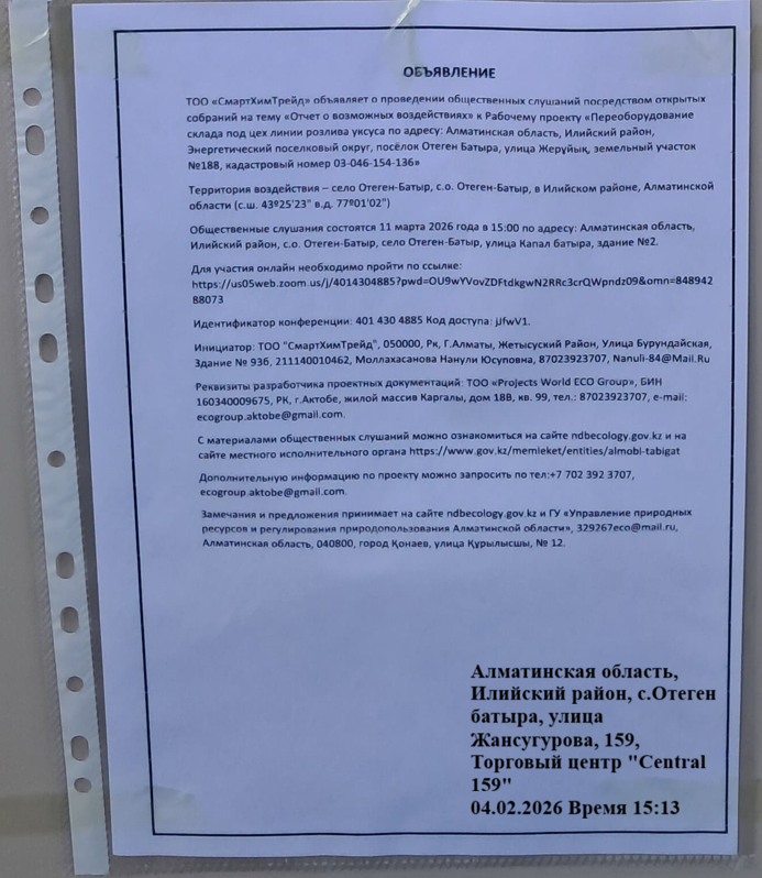По проекту: ТОО «СмартХимТрейд» объявляет о проведении общественных слушаний посредством открытых собраний на тему «Отчет о возможных воздействиях» к Рабочему проекту «Переоборудование склада под цех линии розлива уксуса по адресу: Алматинская область, Илийский район, Энергетический поселковый округ, посёлок Отеген Батыра, улица Жерұйық, земельный участок №188, кадастровый номер 03-046-154-136»
