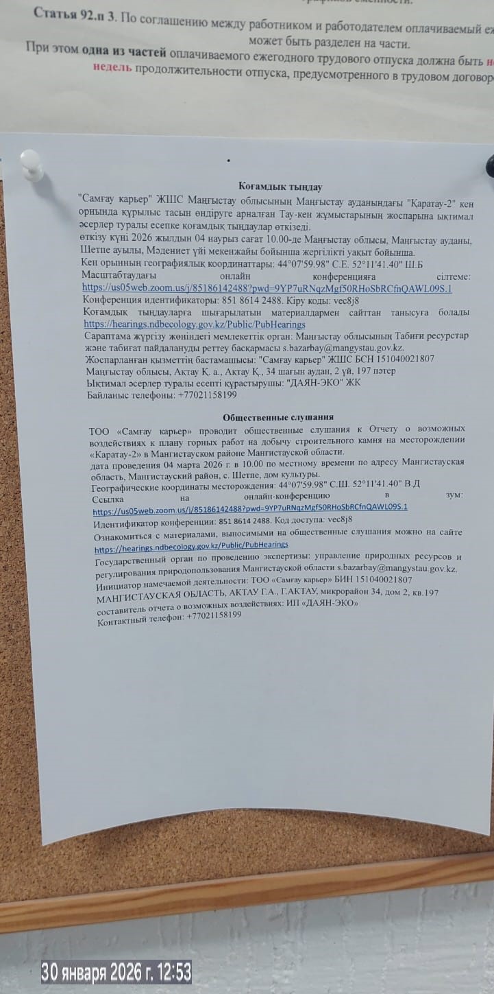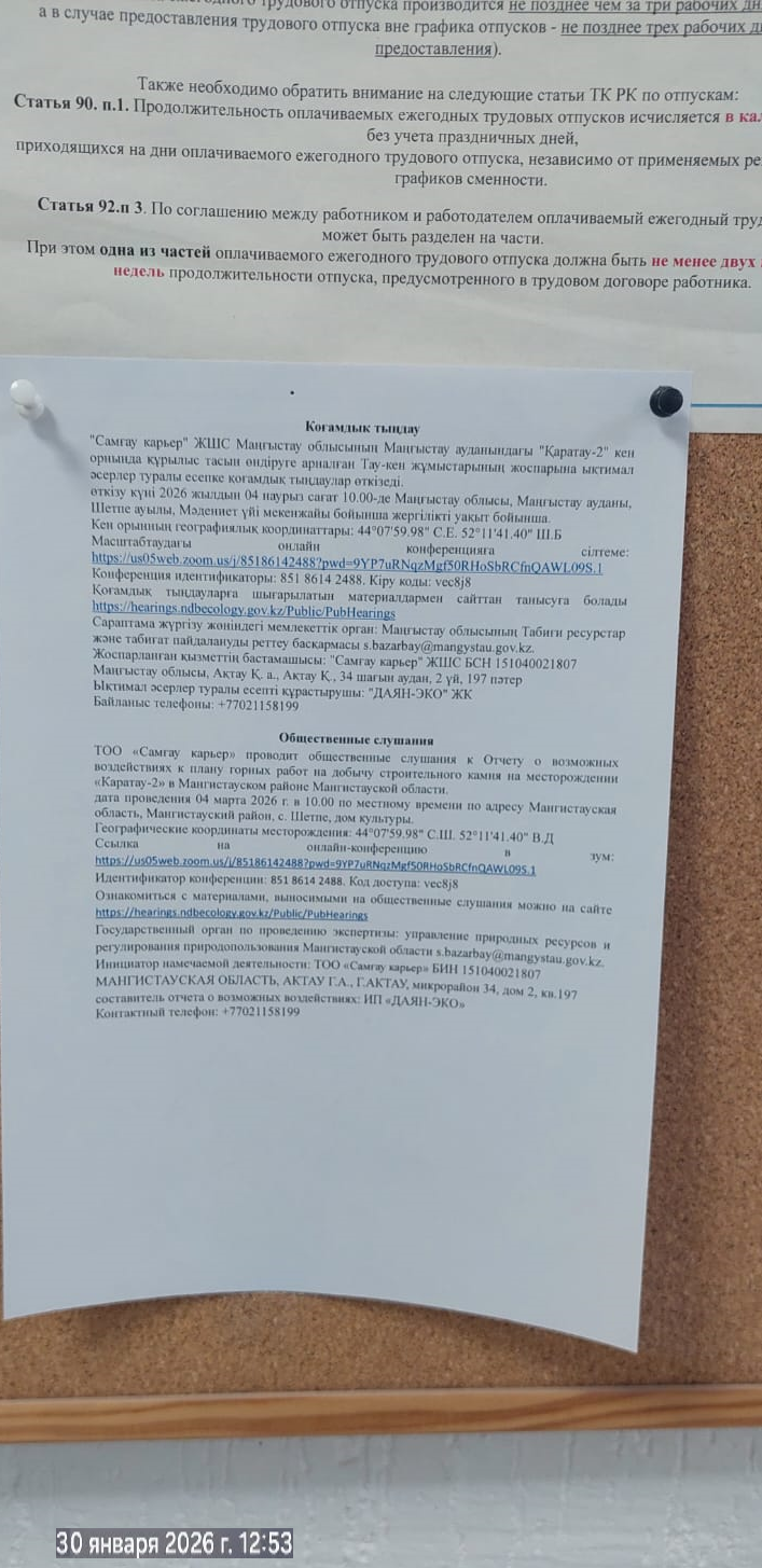 4. Повестка дня общественных слушаний: Участок разработки (карьер) ТОО «СамгауКарьер» административно расположен в Мангистауском районе в 7,0 км к северо-востоку от с. Шетпе. Расстояние по дорогам до г. Актау – 80 км. Площадь Жетыбайского месторождения известняков-ракушечников и рассматриваемого участка по административному делению входит в состав Каракиянского района Мангистауской области, в пределах листов К-39-21-А-а международной разграфки с географическими координатами центра месторождения. Проектируемые к отработке запасы состоят на Государственном балансе и состоянию на 01.01.2021г., в пределах предоставленной для отработки части месторождения, составляют по сумме категорий А+В+С1 = 7485,2 тыс. м3. Площадь в пределах предоставленной для отработки части состоит из двух участков площадью № 1 - 0,43 км2 и № 1 - 0,81 км2. Эксплуатационные остаточные запасы этой части месторождения с учетом потерь и прихвата песчаника в бортах карьера, включая внутренние прослои алевролитов, составляют 600 тыс. м3. При заданной Техническим заданием (приложение 1) производительности карьера по камню за действующий контрактный срок будут отработана часть эксплуатационных запасов. Календарный график горных работ составлен начиная с 2026 г. учитывает производительности экскаватора с учетом обеспечения необходимого фронта работ Общий объем планируемой добычи запасов с учетом потерь первой группы на контрактный срок составляет 600 тыс. м3. Ссылка на онлайн-конференцию в зум: https://us05web.zoom.us/j/85186142488?pwd=9YP7uRNqzMgf50RHoSbRCfnQAWL09S.1 Идентификатор конференции: 851 8614 2488. Код доступа: vec8j8