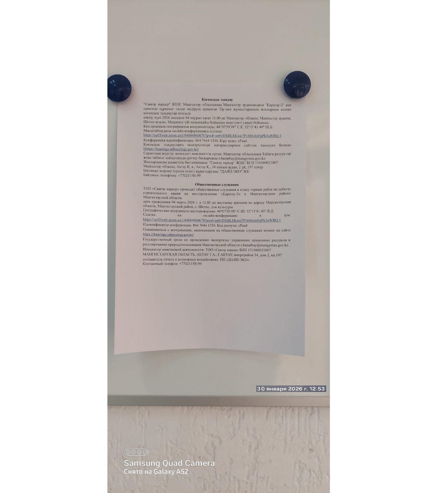4. Повестка дня общественных слушаний: "Самғау карьер" ЖШС Маңғыстау облысының Маңғыстау ауданындағы "Қаратау-2" кен орнында құрылыс тасын өндіруге арналған Тау-кен жұмыстарының жоспарына есепке қоғамдық тыңдаулар өткізеді. өткізу күні 2026 жылдын 04 наурыз сағат 11.00-де Маңғыстау облысы, Маңғыстау ауданы, Шетпе ауылы, Мәдениет үйі мекенжайы бойынша жергілікті уақыт бойынша. Масштабтаудағы онлайн конференцияға сілтеме: https://us05web.zoom.us/j/86476441350?pwd=oq2f2BykSkDkxIeHzQd8fqapWnMfbc.1 Конференция идентификаторы: 848 44860670. Кіру коды: vj5ed5 Қоғамдық тыңдауларға шығарылатын материалдармен сайттан танысуға болады hhttps://hearings.ndbecology.gov.kz/ Сараптама жүргізу жөніндегі мемлекеттік орган: Маңғыстау облысының Табиғи ресурстар және табиғат пайдалануды реттеу басқармасы. Жоспарланған қызметтің бастамашысы: "Самғау карьер" ЖШС БСН 151040021807 Маңғыстау облысы, Ақтау Қ. а., Ақтау Қ., 34 шағын аудан, 2 үй, 197 пәтер Ықтимал әсерлер туралы есепті құрастырушы: "ДАЯН-ЭКО" ЖК Байланыс телефоны: +77021158199 ТОО «Cамғау карьер» проводит общественные слушания к плану горных работ на добычу строительного камня на месторождении «Каратау-2» в Мангистауском районе Мангистауской области. дата проведения 04 марта 2026 г. в 11.00 по местному времени по адресу Мангистауская область, Мангистауский район, с. Шетпе, дом культуры. Ссылка на онлайн-конференцию в зум: https://us05web.zoom.us/j/84844860670?pwd=ze0vf3SBLSKwn7P166bAnFpPk3aWBQ.1 Идентификатор конференции: 864 7644 1350. Код доступа: cPaad Ознакомиться с материалами, выносимыми на общественные слушания можно на сайте https://hearings.ndbecology.gov.kz/ Государственный орган по проведению экспертизы: управление природных ресурсов и регулирования природопользования Мангистауской области. Инициатор намечаемой деятельности: ТОО «Cамғау карьер» БИН 151040021807 МАНГИСТАУСКАЯ ОБЛАСТЬ, АКТАУ Г.А., Г.АКТАУ, микрорайон 34, дом 2, кв.197 составитель отчета о возможных воздействиях: ИП «ДАЯН-ЭКО» Контактный телефон: +77021158199
