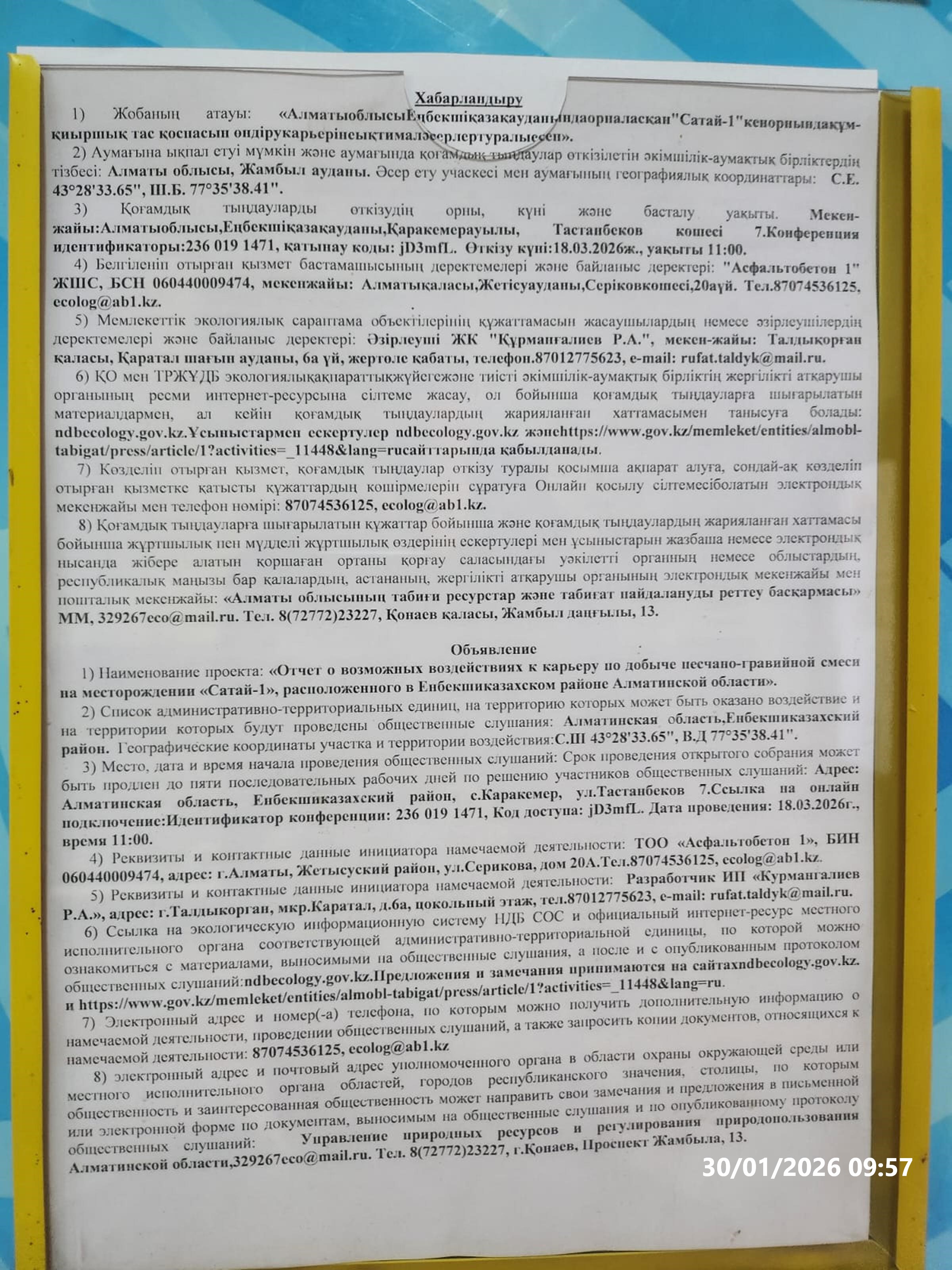 4. Повестка дня общественных слушаний: Согласно акта на земельный участок, месторождение песчано-гравийной смеси «Сатай-1» расположен по адресу: Алматинская область, Енбекшиказахский район, Каракемерский сельский округ. Ближайшим населенным пунктом является с.Сатай, расположенный в 3 км в юго-восточном направлении от участка добычных работ. Участок карьера расположен за пределами населенных пунктов и прилегающих к ним территориям. Участок добычи, выбран на основании: Лицензии на добычу общераспространенных полезных ископаемых за №162 от 06.03.2024г. Акта на земельный участок №2025-3483231, с кадастровым номером земельного участка: 03:044:193:247, с целевым назначением – для добычи песчано-гравийной смеси, и Протокола заседания Южно-Казахстанской межрегиональной комиссии по запасам полезных ископаемых за №3093 от 08.09.2023г. Ранее для данного объекта уже выдавалось заключение по результатам оценки воздействия на окружающую среду к проекту отчета о возможных воздействиях за № KZ94VVX00333744 от 01.11.2024г. и экологическое разрешение на воздействие для объектов II категории за № KZ79VCZ03435582 от 01.03.2024г. Изменения и дополнения разработаны в связи с увеличением объемов добычи песчано-гравийной смеси (ПГС) и с исключением дробильно-сортировочных установок ДСУ №1 и ДСУ №2. В ранее разработанных и согласованных с ГЭЭ проектах ОВОС и РООС были заложены Дробильно-сортировочные установки ДСУ №1 и ДСУ №2 по переработке ПГС, их сейчас по измененному плану горных работ исключили (убрали) с территории карьера. Данные ДСУ №1 и ДСУ №2 будут установлены на отдельной промышленной площадке, за пределами карьера, на отдельном земельном участке. Способ и система разработки (добычи) месторождения, режим работы и технология ведения горных работ остались без изменения. Изменения внесены только в календарный план объемов добычи ПГС и исключили (убрали) ДСУ №1 и ДСУ №2 с территории карьера. Объем добычи песчано-гравийной смеси по месторождению составит: - 888,889 тыс.м3/год или 2000 тыс.тонн/год (средний объемный вес ПГС по участку составляет 2,25 тонн/м3). Ранее по действующему проекту объем добычи по месторождению составлял 1300 тыс.тонн/год. В сравнении с предыдущим проектом, объем добычи по измененному проекту плана горных работ увеличится на 700 тыс.тонн/год (2000 тыс.тонн/год - 1300 тыс.тонн/год = 700 тыс.тонн/год). Добычные работы на карьере планируются произвести с 2026 года по 2034 год включительно. Добычные работы на карьере будут вестись в одну смену по 8 часов в сутки, 250 дней в году. Предполагаемый годовой объем добычи песчано-гравийной смеси (ПГС) составляет – - 888,889 тыс.м3/год или 2000 тыс.тонн/год (средний объемный вес ПГС по участку составляет 2,25 тонн/м3). Общая численность работающих на территории карьера составит – 4 человека. Для условия труда рабочего персонала на участке добычи предусматриваются передвижные вагончики. Планируемая площадь участка добычи на 2026-2034гг составит – 25,7 га. Горно-геологические условия залегания продуктивной толщи, на участке, представляются простыми и благоприятными для разработки открытым способом. Планом принят следующий порядок ведения горных работ: - с помощью бульдозера и погрузчика производится снятие и перемещение почвенно-растительного слоя (ПРС вскрыши) в бурты по периметру месторождения. После завершения добычных работ данные породы будут использованы 