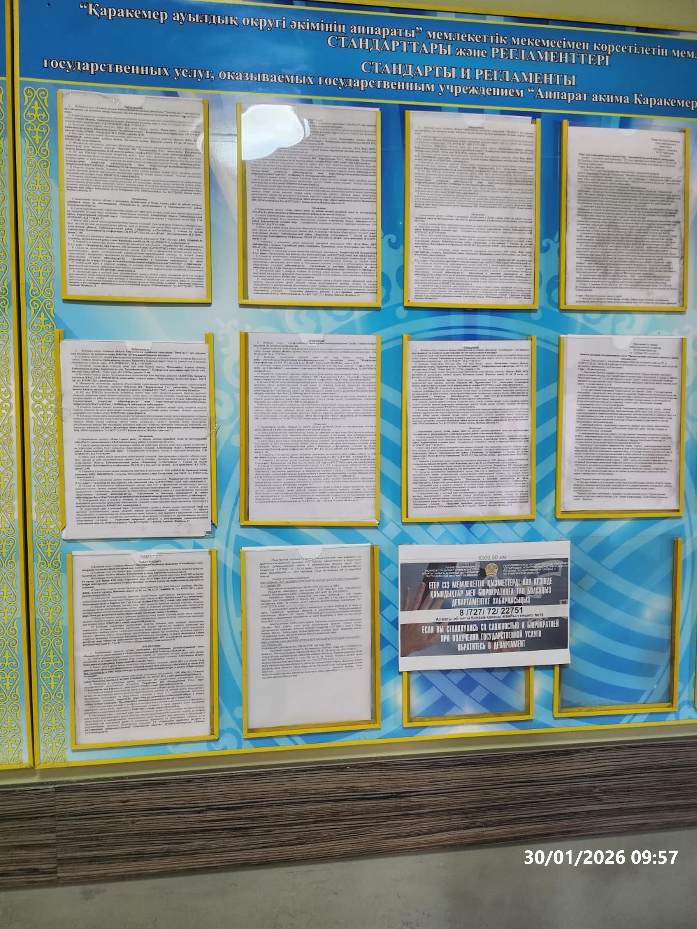 6.3. расположение мест, специально предназначенных для Размещения печатных объявлений (доски объявлений): Доска объявлений Акимата