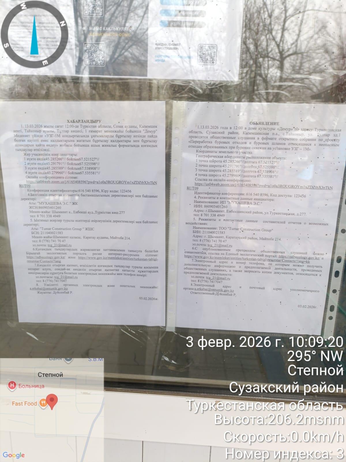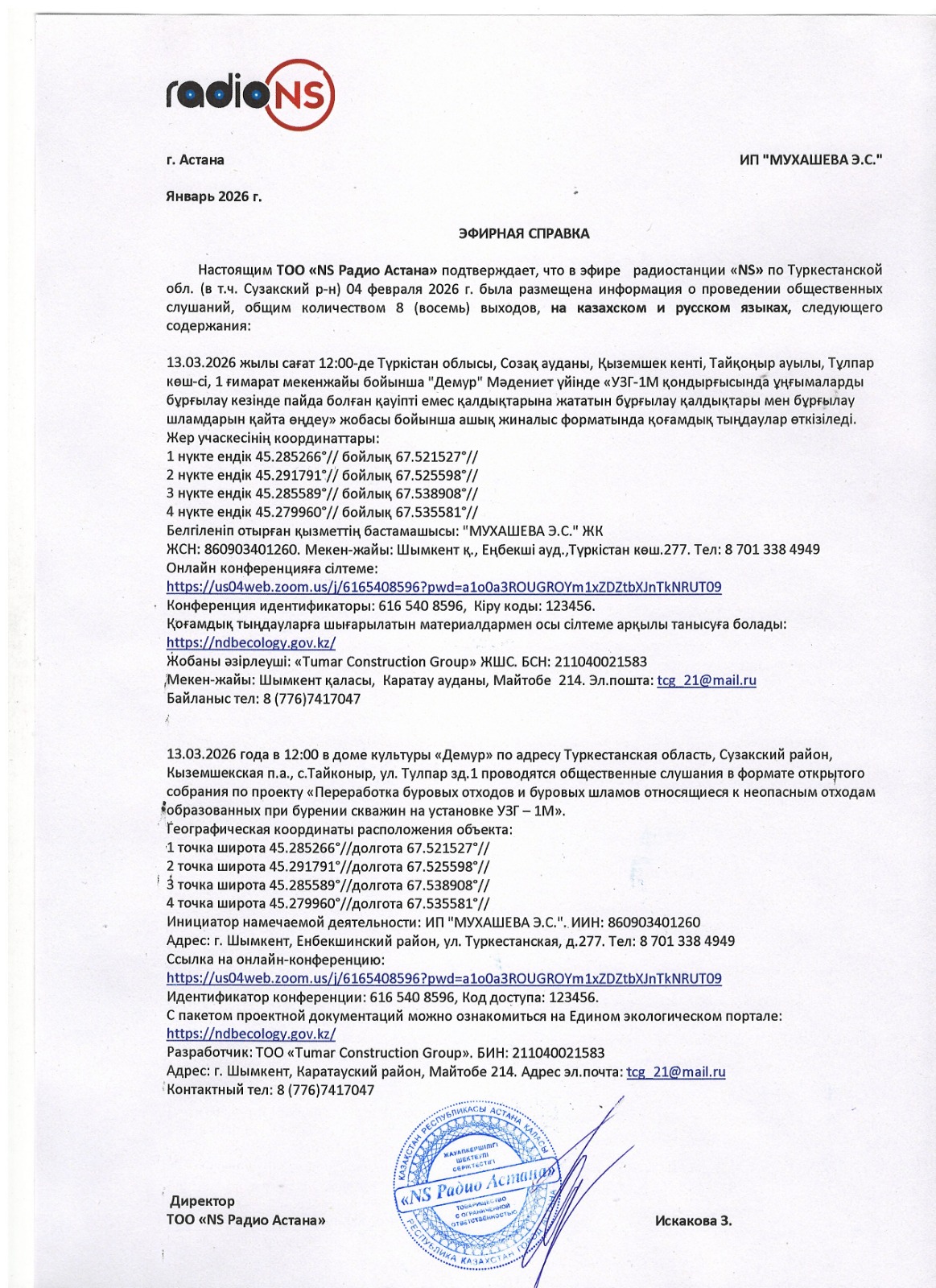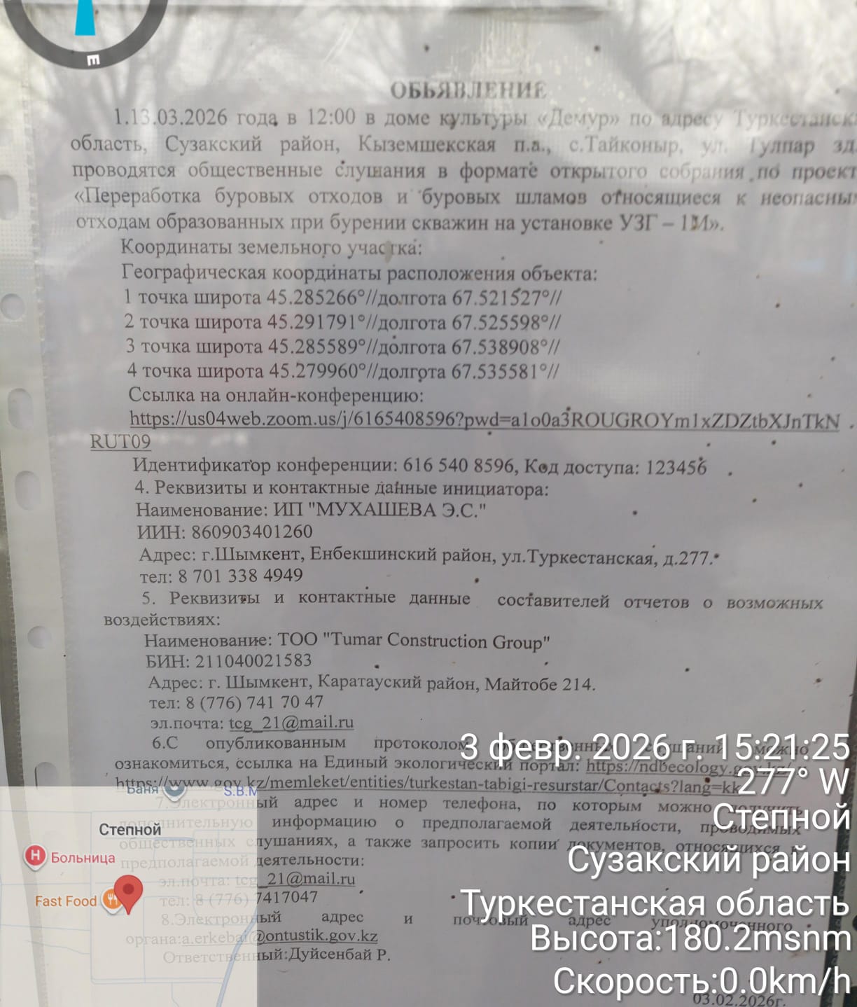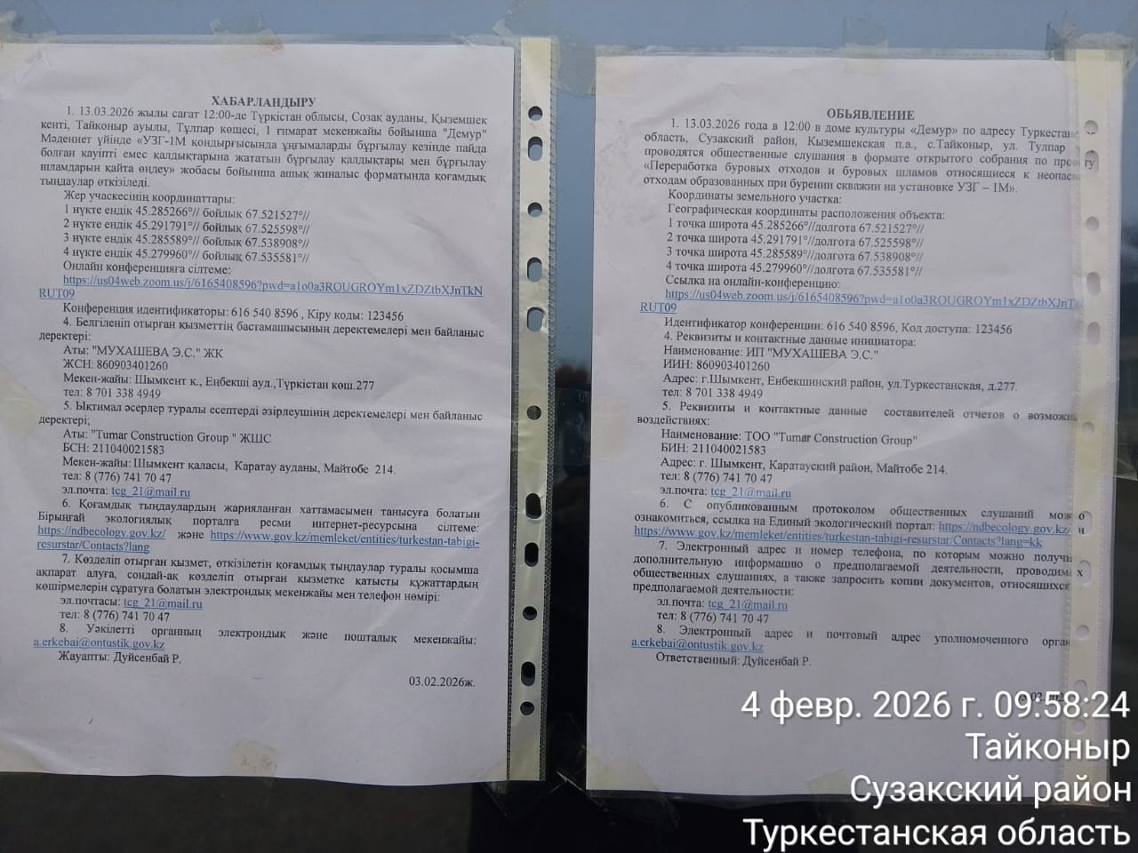 3. Общественные слушания организованны: Управление природных ресурсов и регулирования природопользования Туркестанской области, a.erkebai@ontustik.gov.kz,