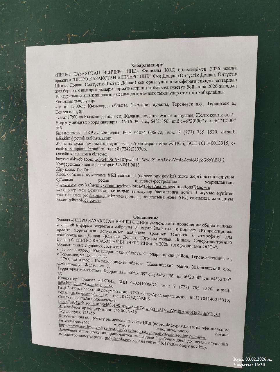3. Общественные слушания организованны: Управление природных ресурсов и регулирования природопользования Кызылординской области, prd@korda.gov.kz 87242605362, 605369,