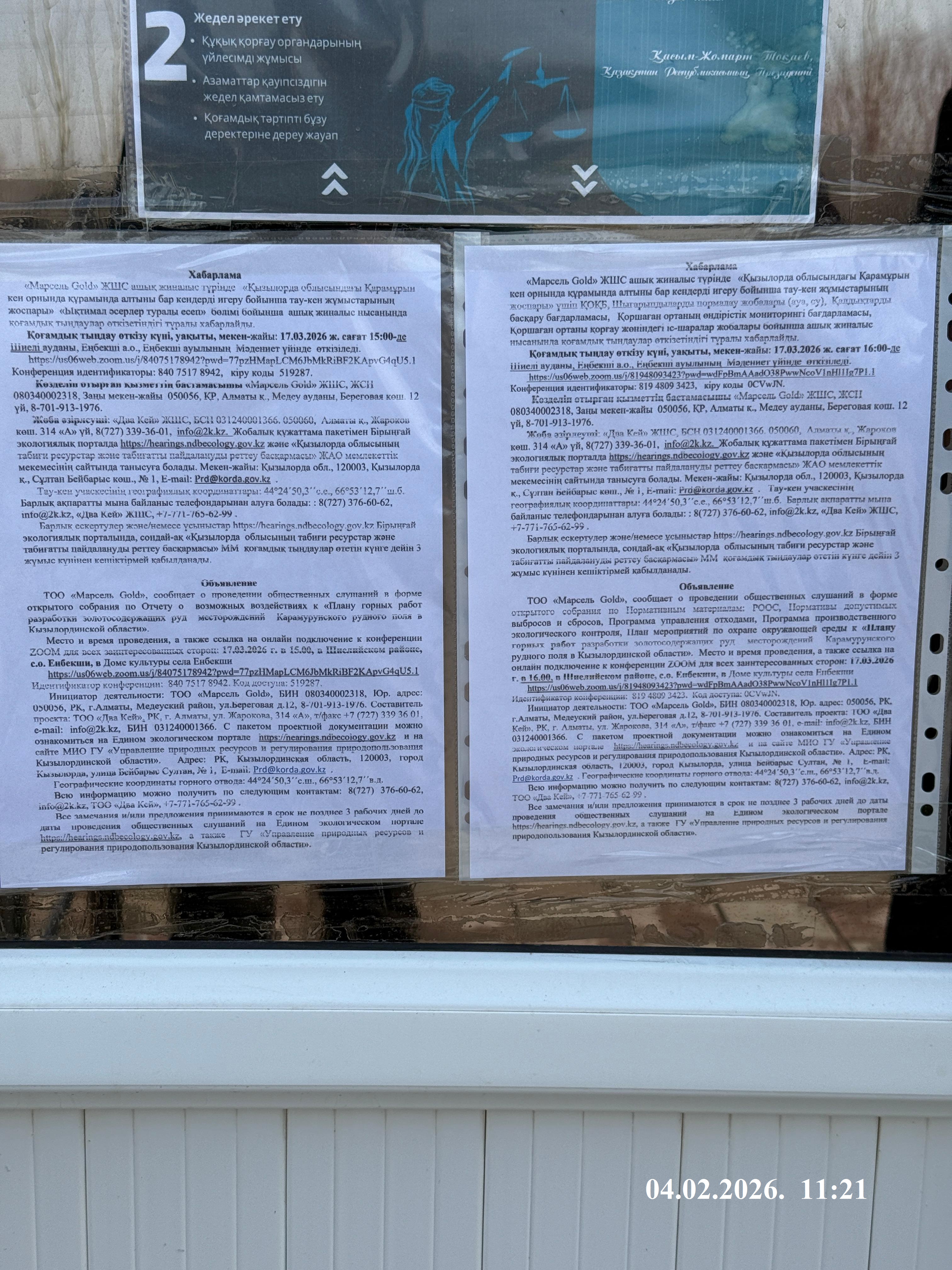 3. Общественные слушания организованны: Управление природных ресурсов и регулирования природопользования Кызылординской области, prd@korda.gov.kz 87242605362, 605369,