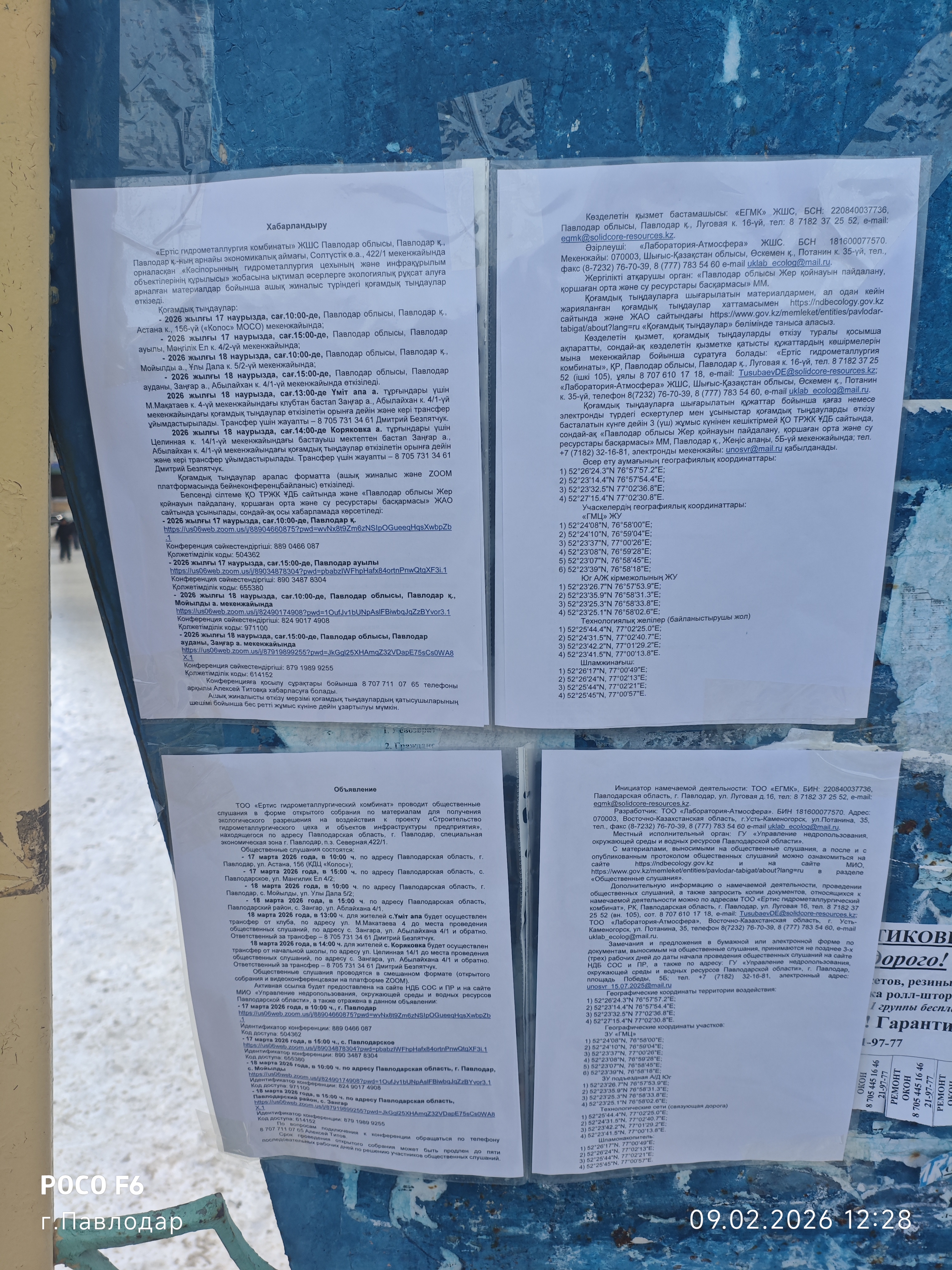 6. Объявление о проведении общественных слушаний на казахском и русском языках будет распространено следующими способами: