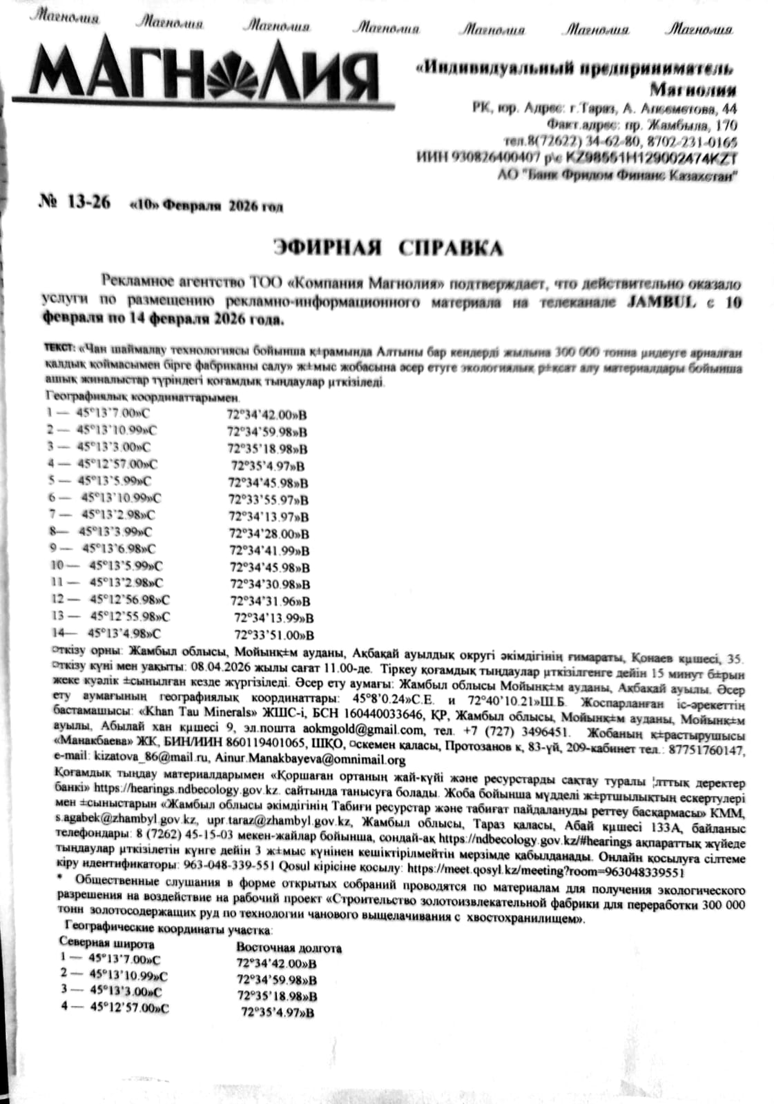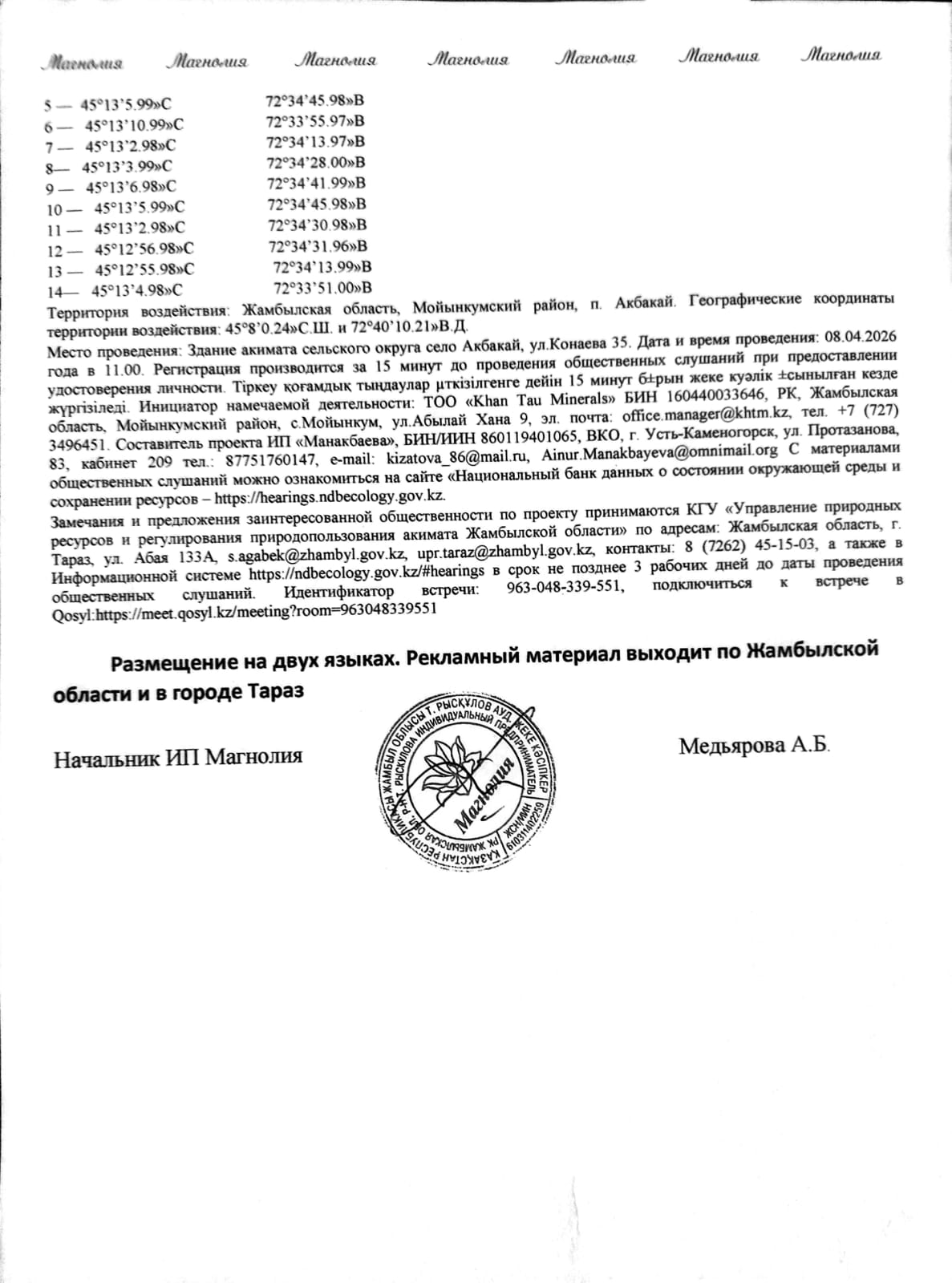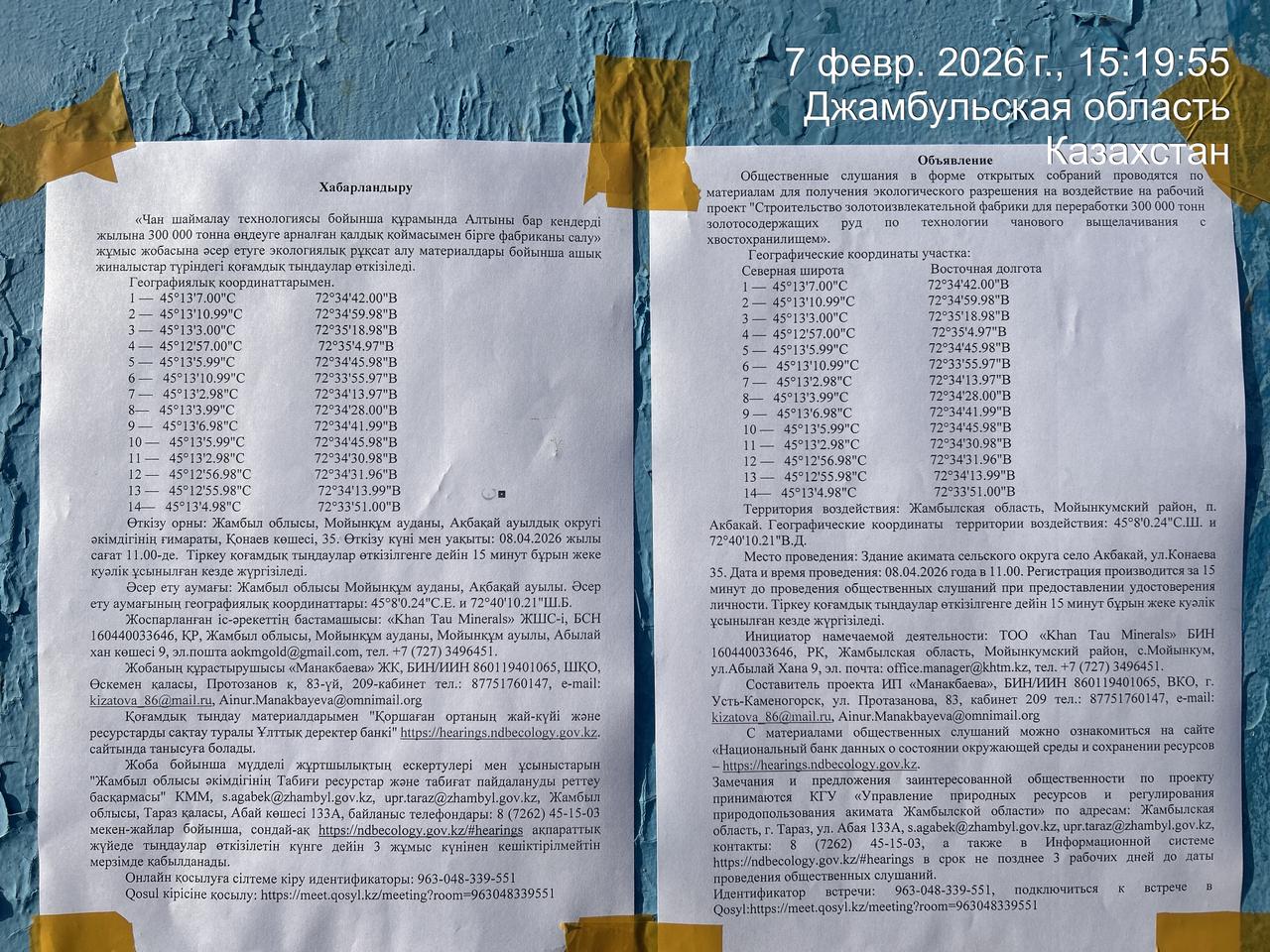 3. Общественные слушания организованны: Управление природных ресурсов и регулирования природопользования Жамбылской области, s.agabek@zhambyl.gov.kz,