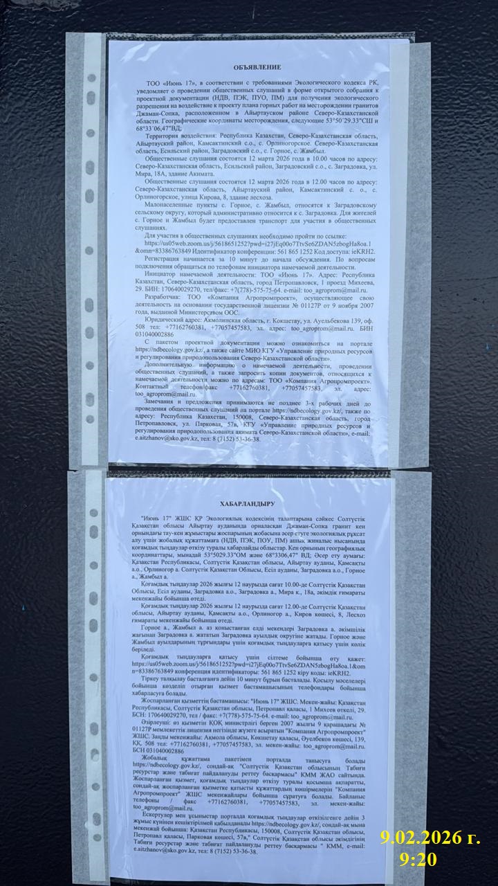3. Общественные слушания организованны: Управление природных ресурсов и регулирования природопользования Северо-Казахстанской области, e.aitzhanov@sko.gov.kz,